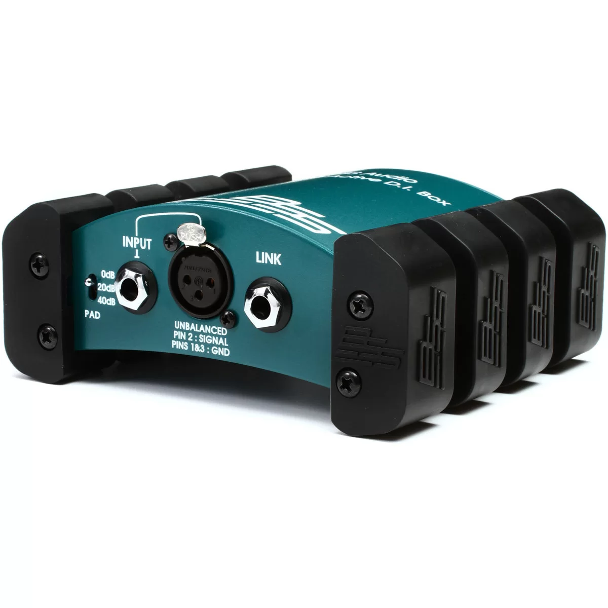 У него есть возможность питания от батареи 9В и от фантомного питания усилителя/микшера. В случае, если фантомное питание отключается, директ-бокс автоматически переключается на батарею, обеспечивая непрерывное использование. Для подключения источников используется небалансный вход на разъеме 1/4" TS Jack, для выхода применяется балансный XLR-M. Рядом со входом расположен сквозной разъем Thru на таком же типе разъема. Корпус подразумевает размещение кабелей внизу, для этого он сделан приподнятым за счет бамперов.