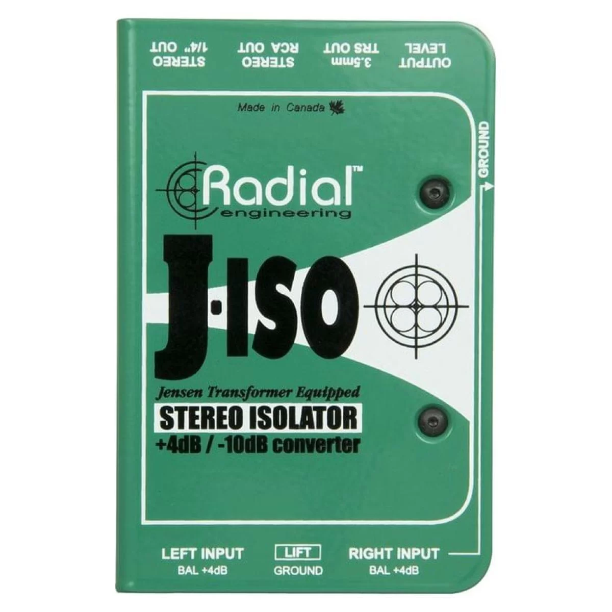 Radial J-ISO - профессиональный стерео изолятор, предназначенный для преобразования симметричного сигнала +4 дВ в небалансный сигнал -10 дВ бытовых потребительских аудио устройств, таких как диктофон, CD - рекордер или компьютер. В основе J-ISO лежит легендарный трансформатор Jensen для оптимальной передачи сигнала с минимизацией искажений и артефактов.. В его пассивной конструкции 100% дискретных компонентов. Регулировка уровня позволяет изменять входной сигнал для предотвращения перегрузок. Выходныйе разъемы включают стерео пары 1/4" Jack, 2 х RCa и 3,5 мм стереоджек. Стальная конструкция также помогает в защите трансформаторов от внешних магнитных полей. Фирменное антивибрационное основание с защитой от проскальзывания улучшает механическую и электрическую изоляцию в целях сокращения возможностей появления стороннего шума.