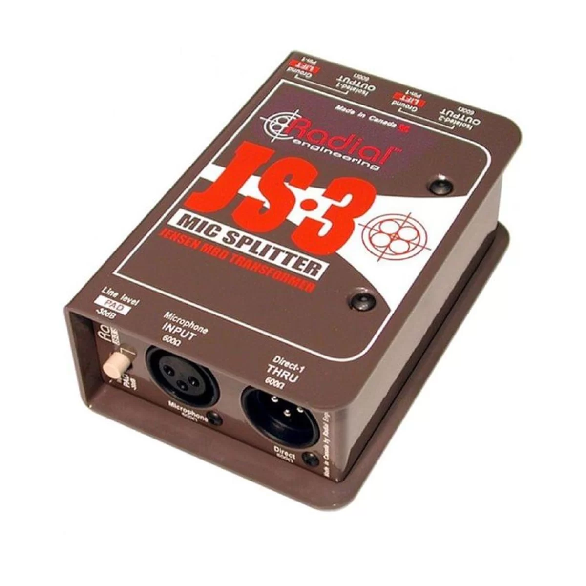 Radial JS3 - микр. сплиттер с трансформатором Jensen, вход 1x XLR, сквозной 1x XLR, выход 2x XLR.
