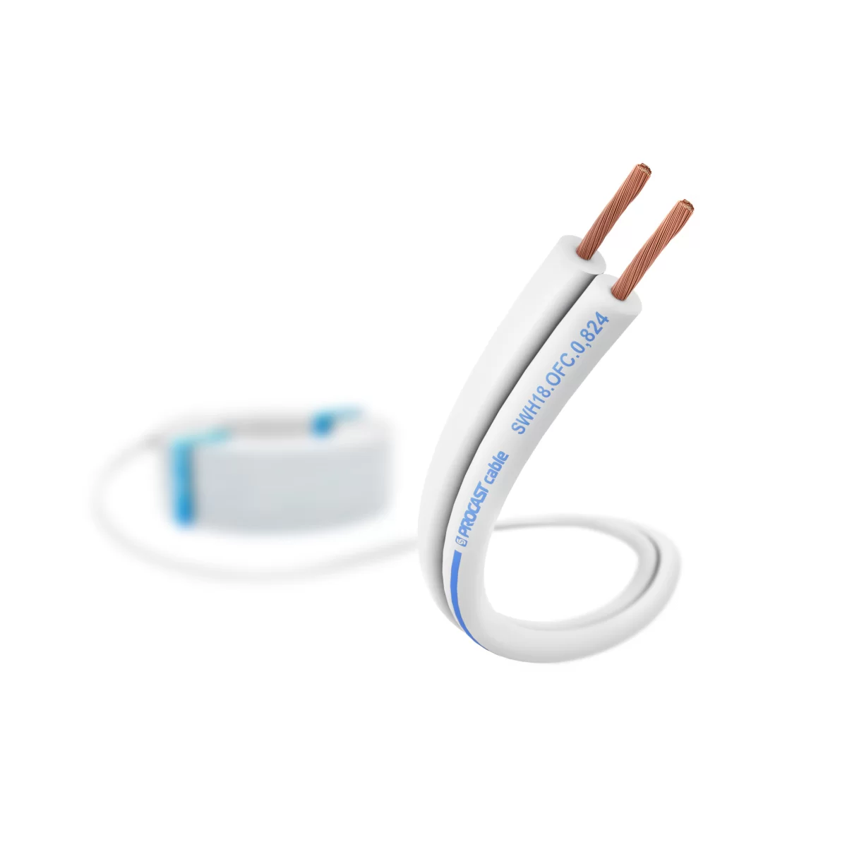 Внешняя изоляция спикерного кабеля PROCAST Cable SWH18.OFC.0,824 изготовлена из очень качественного и долговечного пластиката (PVC) окрашенного в белый цвет с серой маркировкой для обозначения полярности. Это позволяет подключить белую корпусную акустическую систему установленную на стене белого цвета, абсолютно незаметно (без традиционно торчащих за колонкой цветных акустических кабелей). Рекомендуем! Жилы легко разделяются и зачищаются. Диапазон рабочих температур для изоляции -40С / +70С. Кабель поставляется в бухтах по 100 метров.