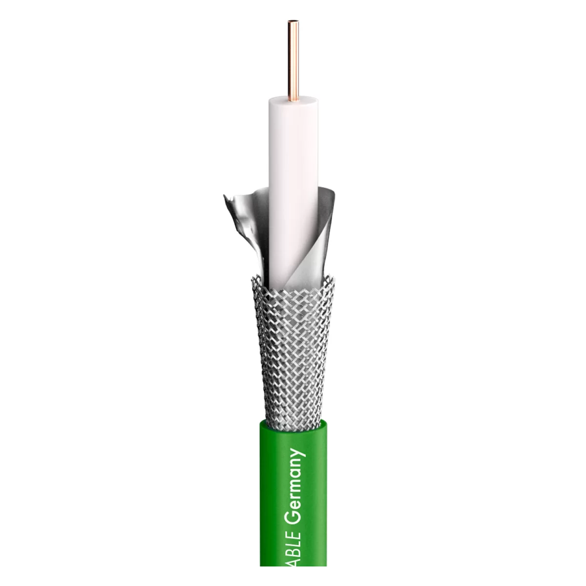 Толстая медная жила диаметром 1 мм (AWG 18) и комбинированный экран (плетеный медный + фольгированный AL/PT) обеспечивают низкий уровень затухания и большую дальность передачи сигнала. Диаметр кабеля 7,1 мм, масса одного метра 64 г. Огнестойкая оболочка, не подверженная коррозии (FRNC) зеленого цвета. Рабочие температуры: от -30 до +70 °C. Кабель применяется для работы в студии, в цифровом и кабельном телевидении, пригоден для использования в сухих и влажных помещениях.