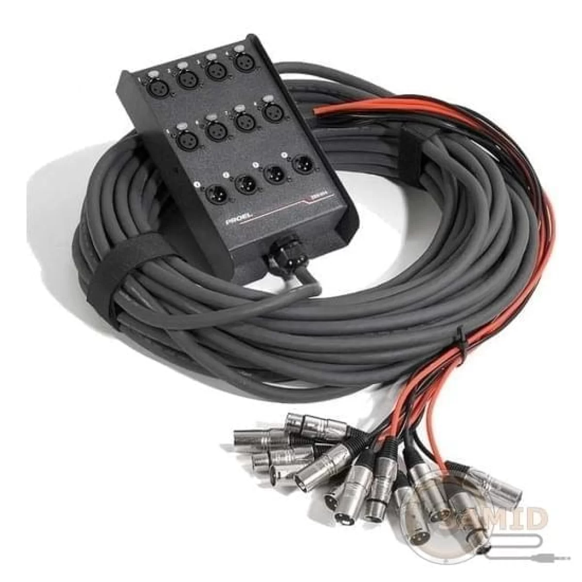 Покрытие износостойкая краска. Малый вес и незначительные потери сигнала характеризуют их как профессиональный инструмент. Высокое качественные, с позолоченными контактами разъёмы XLR, защищенные PVC жакетами. CMF кабель с мультиосновой, имеет заземляющий контакт. На коробке смонтированы панельные XLR: Входы – 8 XLR «мама» Выходы (возвраты) – 4 XLR «папа» длина - 25 м