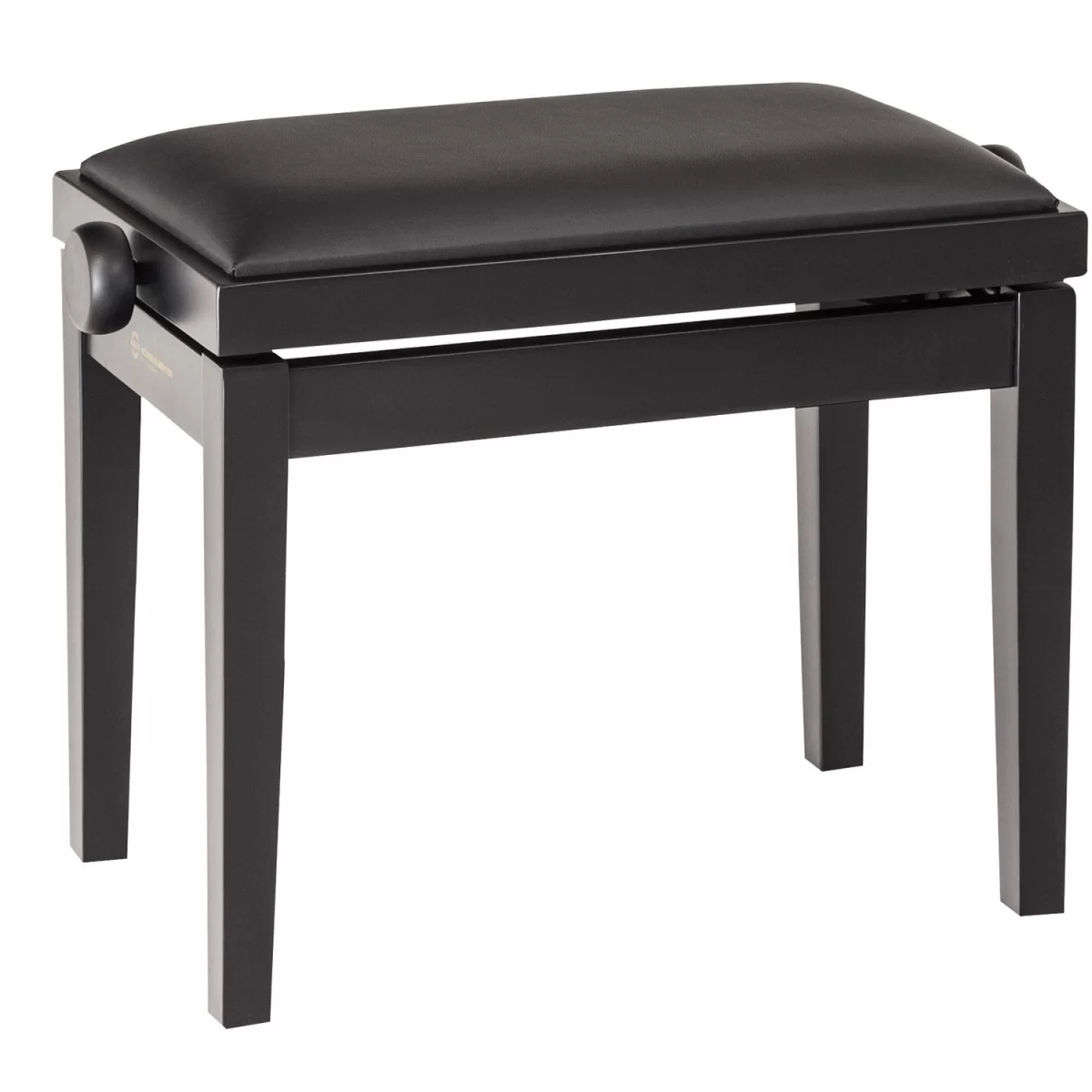 Представляем вам роскошную деревянную банкетку для фортепиано, сделанную из твердых сортов европейского бука. Дерево покрыто четырьмя слоями черного матового лака. Ножки снабжены специальными резиновыми заглушками, которые препятствуют скольжению. Высота легко регулируется вручную. Помимо прочной конструкции эта банкетка характерна своим невероятно удобным сиденьем, сделанным из ДСП, подушка которого обтянута качественной искусственной кожей чёрного цвета.