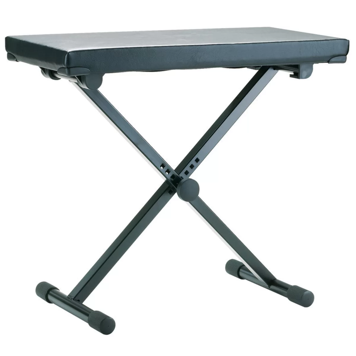 Удобная складная скамейка для клавишника с регулируемой высотой. Сиденье покрыто искусственной кожей. Имеется регулируемый концевой колпачок для стабилизации стула на неровных поверхностях. Складывается для удобства транспортировки.