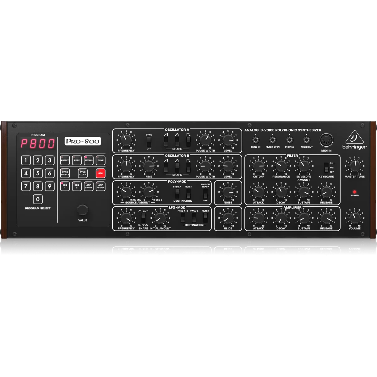 Behringer PRO-800, аналоговый клон культового синтезатора Sequential PRO-600 1982 года с 8-тональной полифонией создан в сотрудничестве с известным разработчиком GliGli, известным своими модификациями Pro-600. Вместо того, чтобы клонировать устройство как оно было, они подняли этот культовый синтезатор на новый уровень, добавив полную полифонию (Pro-600 - 6 голосов) и 8 голосов.