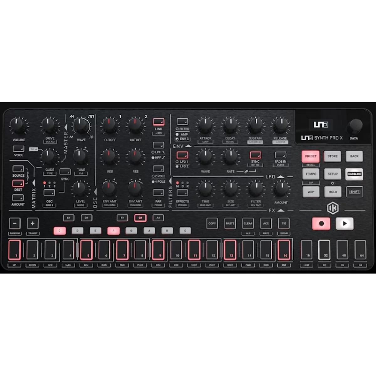 IK MULTIMEDIA UNO SYNTH PRO X обладает встроенным 64-шаговым секвенсором с возможностью пошаговой записи до 48 параметров, режимами: Legato, Mono и Paraphonic, опцией Bassline, арпеджиатором (10 режимов) и функцией Sequence Randomizer (позволяющей секвенсору автоматически генерировать последовательности, следующие выбранной пользователем шкале). Для коммутации предусмотрен парный выход TRS (L-R), четыре разъёма мини-джек 3.5-мм с парой входов/выходов CV/Gate, монофонический вход 3.5-мм, стереовыход для наушников 3.5-мм, разъёмы MIDI I/O и порт USB-C.