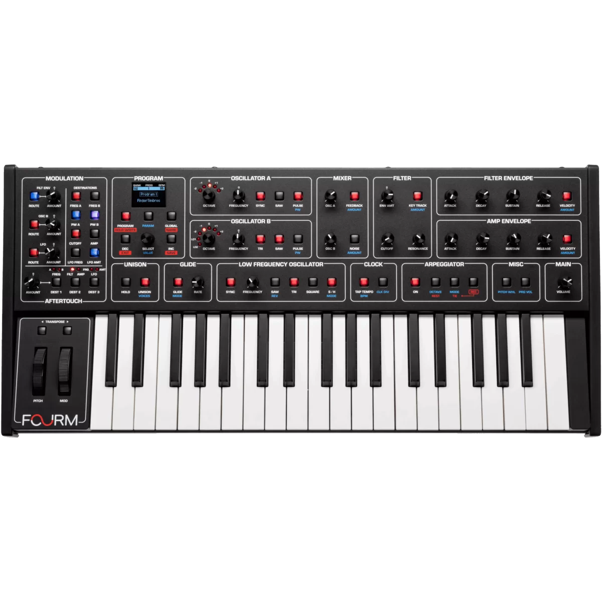 SequentialSequential Fourm — компактный 4‑голосный аналоговый синтезатор с характерным тоном линейки Prophet и отзывчивой клавиатурой Tactive™ со слим‑клавишами и полифоническим aftertouch.