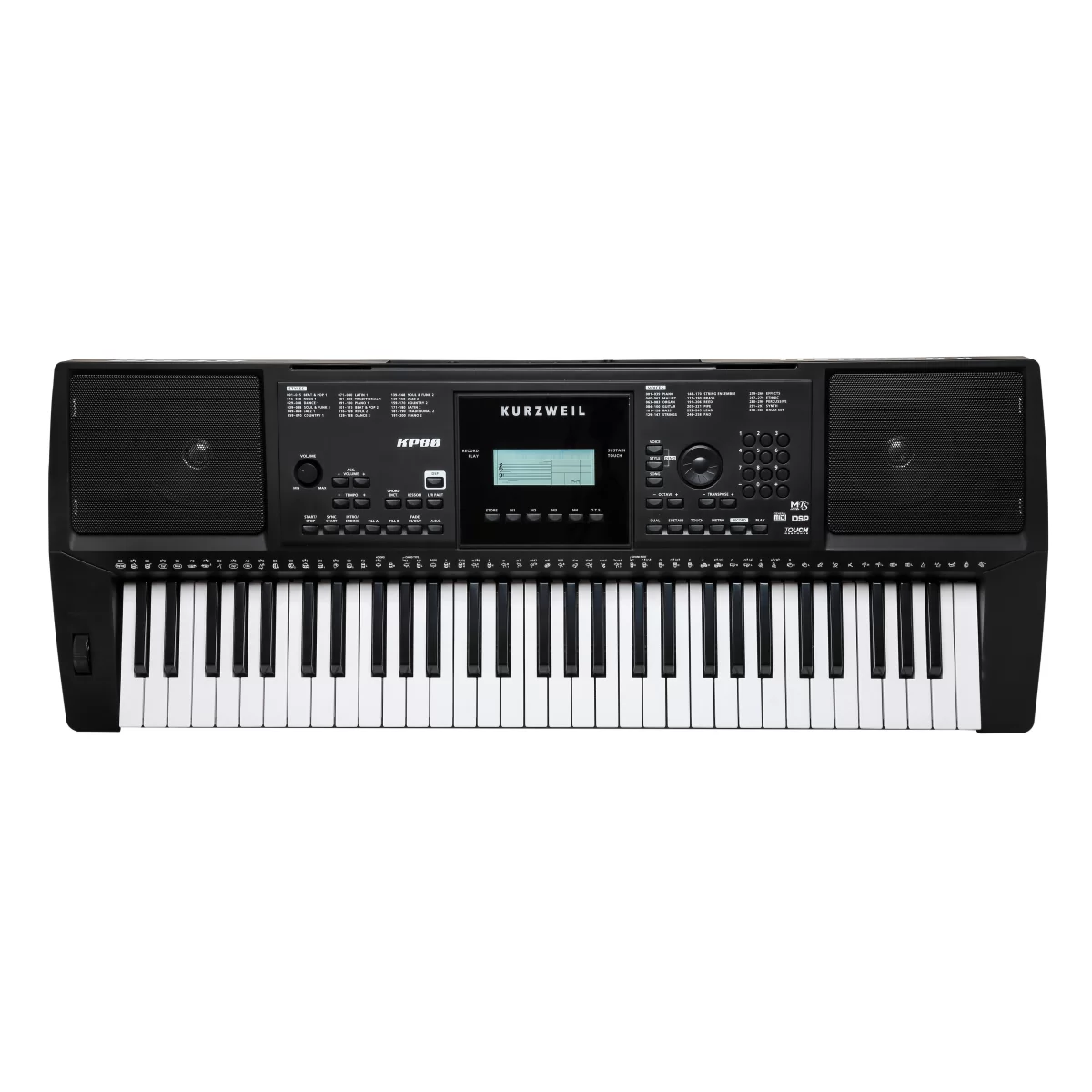 Kurzweil KP80 - Это уникальный синтезатор с автоаккомпанементом, который предлагает полноразмерную чувствительную к скорости клавиатуру с 61 клавишей, оснащенной модулями высоты тона и модуляции.