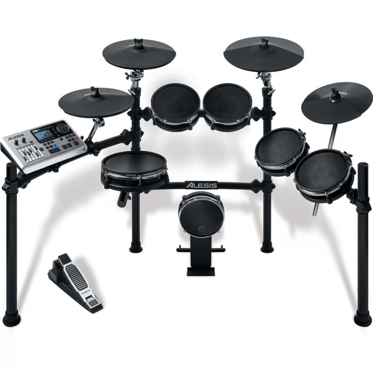Alesis DM10 Studio Mesh Kit – электронная барабанная установка, состоящая из звукового модуля, сетчатых пэдов для бочки, сольника, 4 томов, 4 тарелок и опорной стойки.
