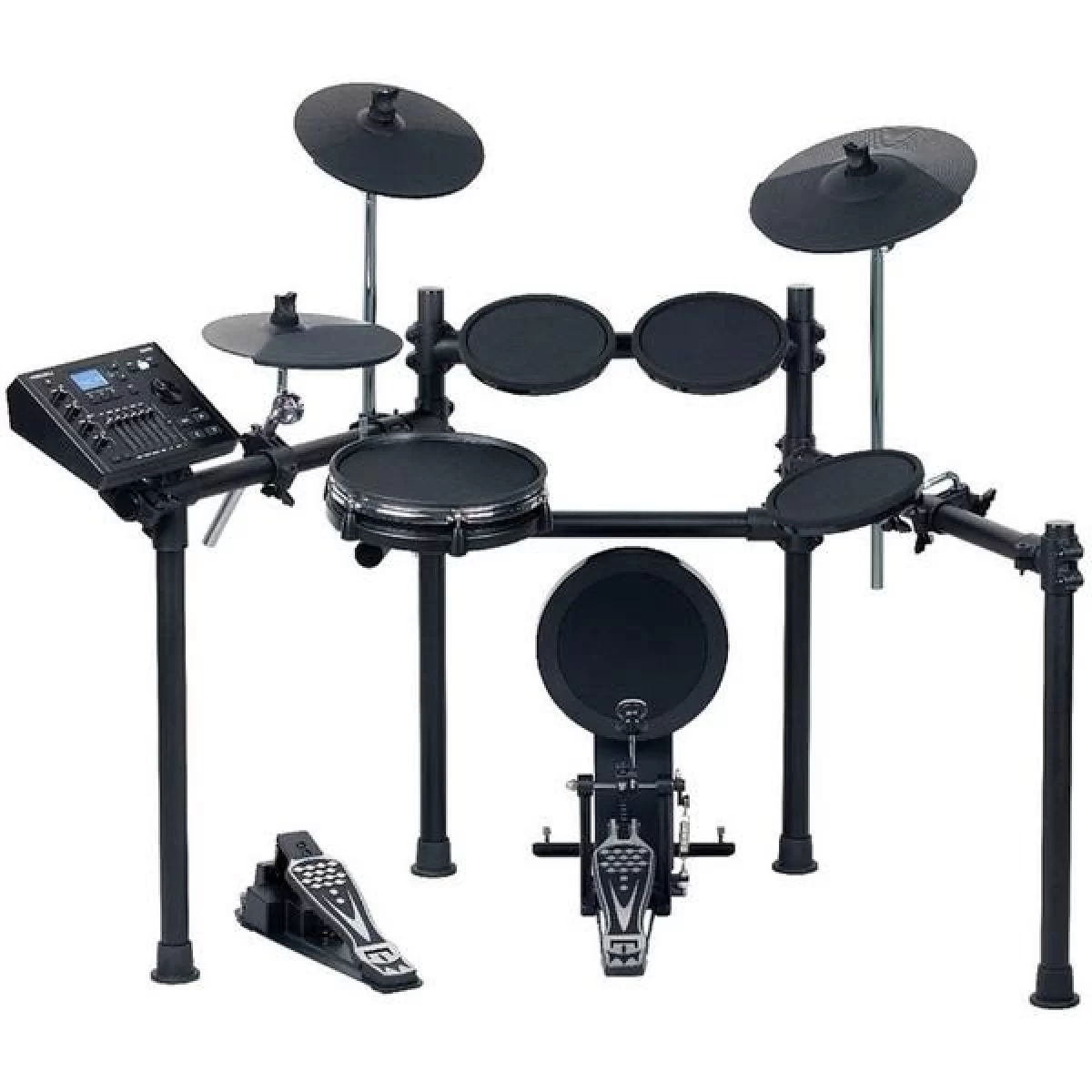 - В составе звуковой модуль, бас-бочка с педалью, малый барабан с сетчатым пластиком, 3 тома, тарелки крэш и райд, хай-хэт с педалью