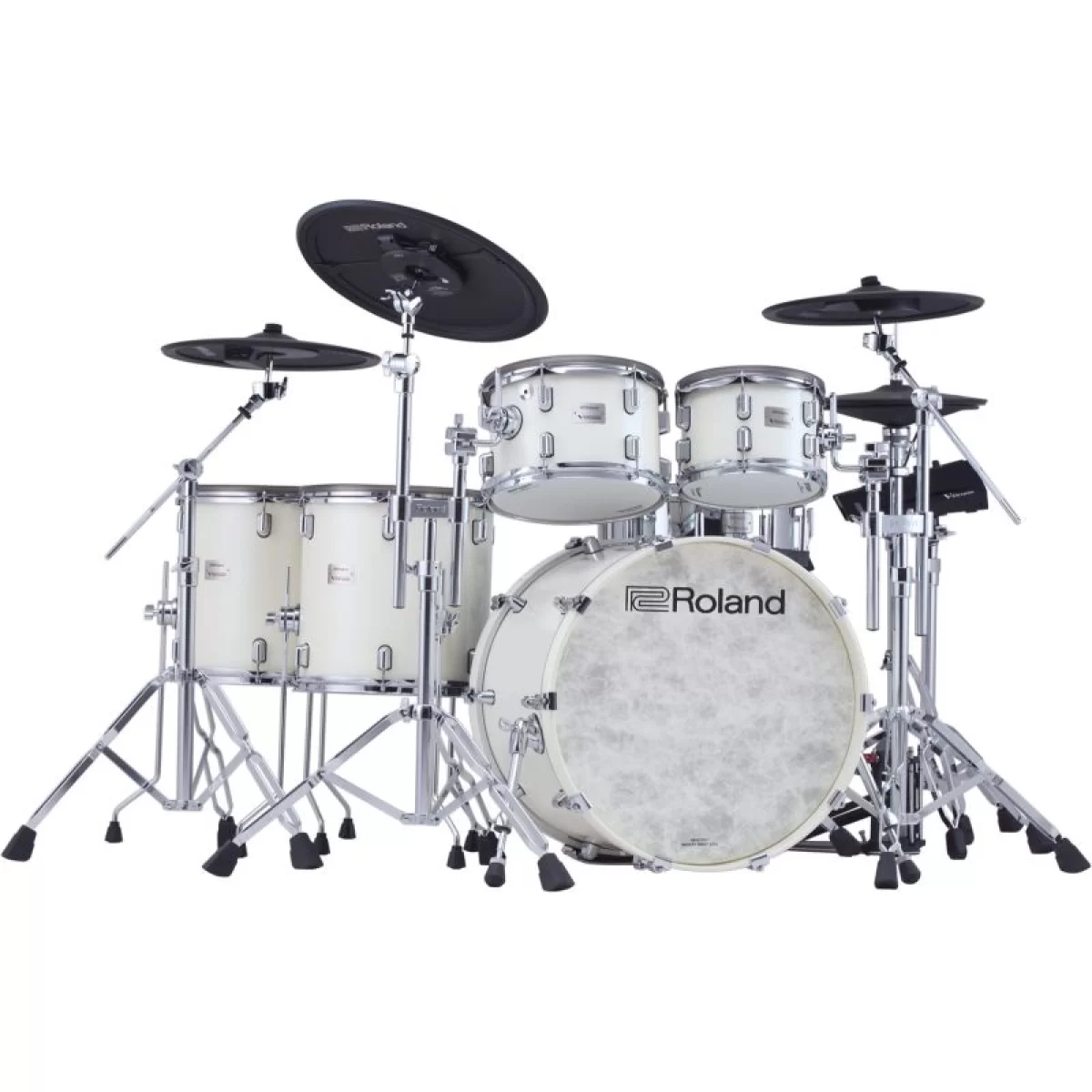 - Набор V-Drums Acoustic Design из шести частей с полноразмерными деревянными корпусами и хромированными стойками с двойными опорами
