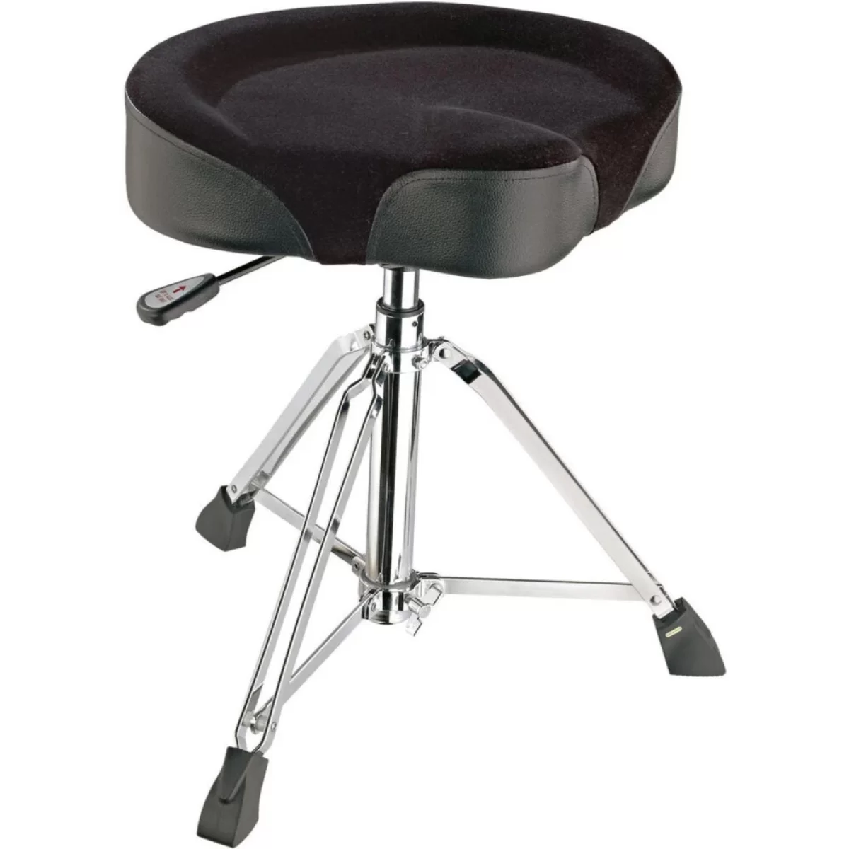 Этот прочный барабанный стул дает то качество, удобство и устойчивость, которые нужны профессиональным барабанщикам. Сиденье имеет эргономичную форму, богатую обивку и велюровый чехол, отводящий пот: оно отлично поддерживает, но не сковывает движения. Регулировка высоты удобная и простая — за счет встроенного пневматического подъемника, который срабатывает рычажком под сиденьем. Высоту можно плавно менять в диапазоне от 495 до 680 мм. Три ноги с двойными распорками и большие резиновые наконечники обеспечивают надежную устойчивость.