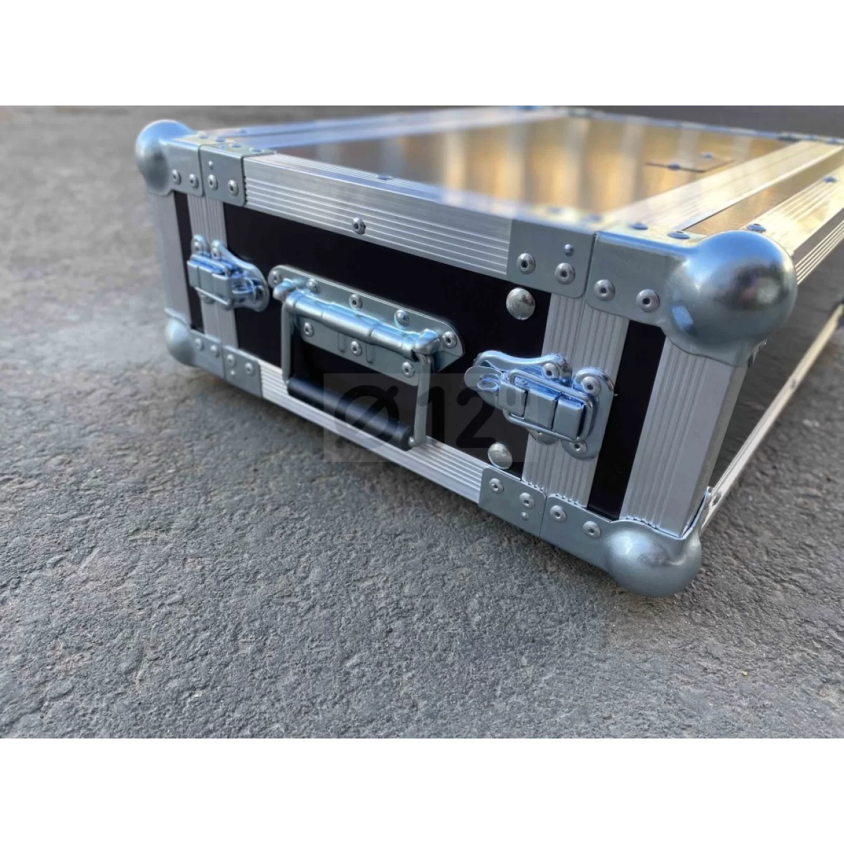 Кейс изготовлен из березовой ламинированной фанеры толщиной 6 мм (пр-во Россия). Оснащен рэковыми направляющими с фронтальной стороны, двумя съемными крышками, четырьмя замками-защелками, двумя накладными подпружиненными ручками. Четыре резиновые ножки высотой 20 мм. Глубина кейса - 270мм (без учета крышек).