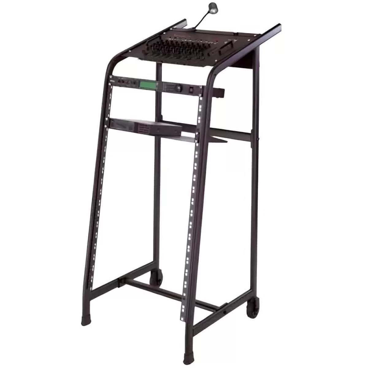 В вертикальном пространстве могут разместиться приборы высотой 20U, и еще 8U можно разместить на наклонной плоскости сверху. Стойка опирается спереди на ножки, а сзади снабжена двумя прочными колёсами для мобильности и лёгкого перемещения. Основной для стойки служат стальные трубки диаметром 40х20 мм. Она окрашена чёрной нетоксичной порошковой краской.