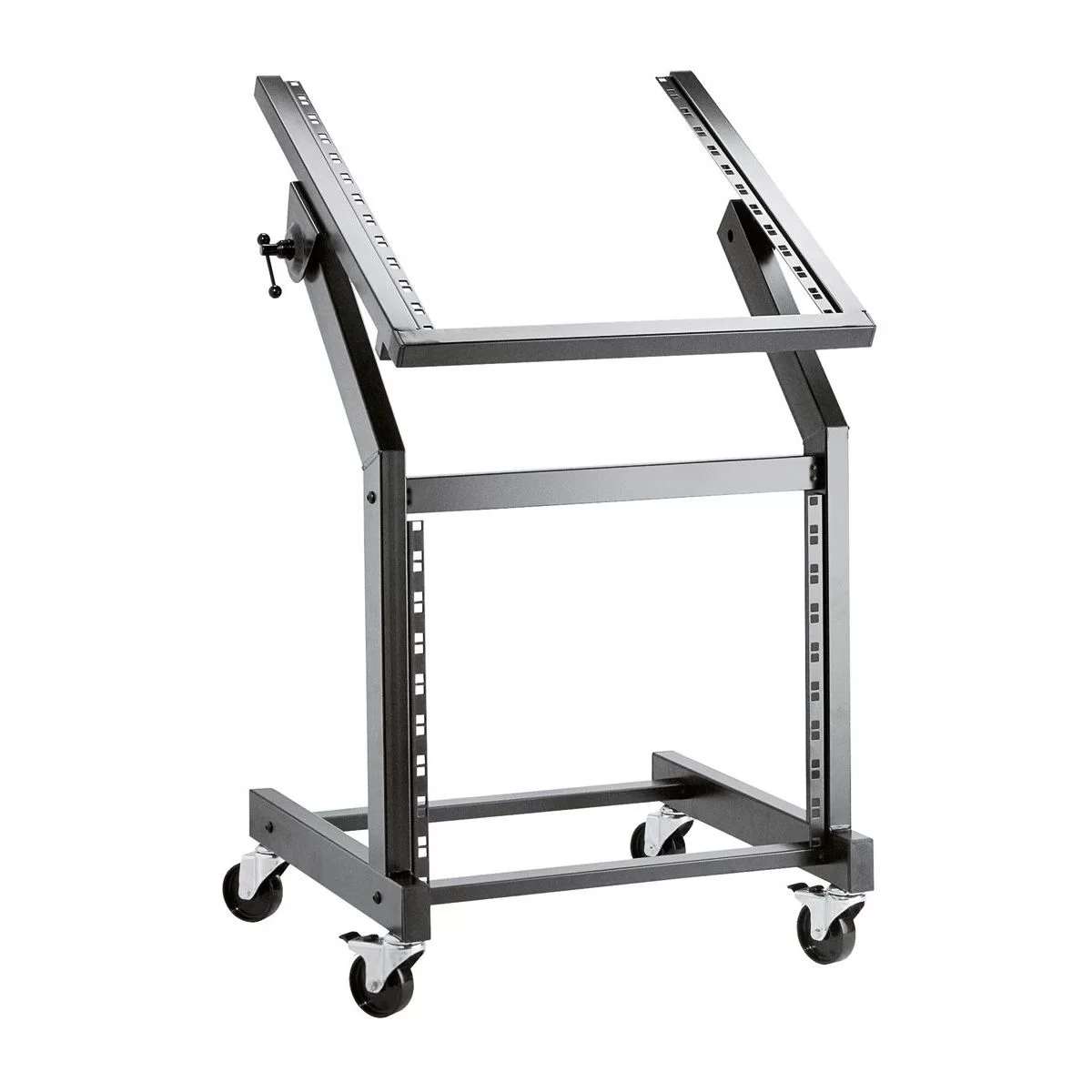 Стойка состоит из металлической рамы черного цвета и двух зон для размещения приборов - нижняя зона на 9U и поворотный стол на 12U. есть возможность изменить угол наклона верхней рамы в диапазоне от 45 градусов до параллельного (относительно пола). Также, колеса оборудованы фиксирующим механизмом для препятствия перемещению стойки. Все монтажные отверстия оптимизированы для болтов M5/6. 42020-000-55 рассчитана для приборов суммарным весом до 50 кг. В комплекте 32 болта M5 с гайками.