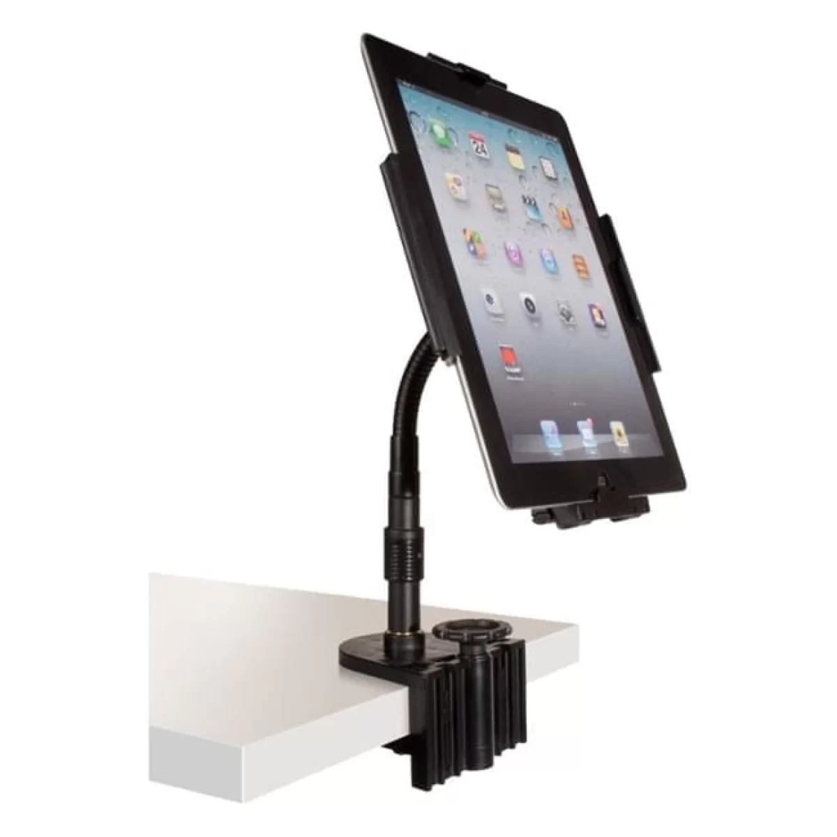 Это позволяет размещать планшет практически в любом месте, где вам удобно: дома, в кафе, в студии на репетиции и т.д. Стойку можно использовать как в горизонтальной ориентации, так и в вертикальной, а также применять для любых других марок планшетов с подходящими габаритами. Толщина микрофонной стойки для размещения зажима должна составлять от 20 до 32 мм, настольный зажим может быть размещен на поверхности толщиной от 12,7 до 41 мм. Может быть установлена в верхней части микрофонной стойки на резьбовом винте стандартного размера 5/8”.