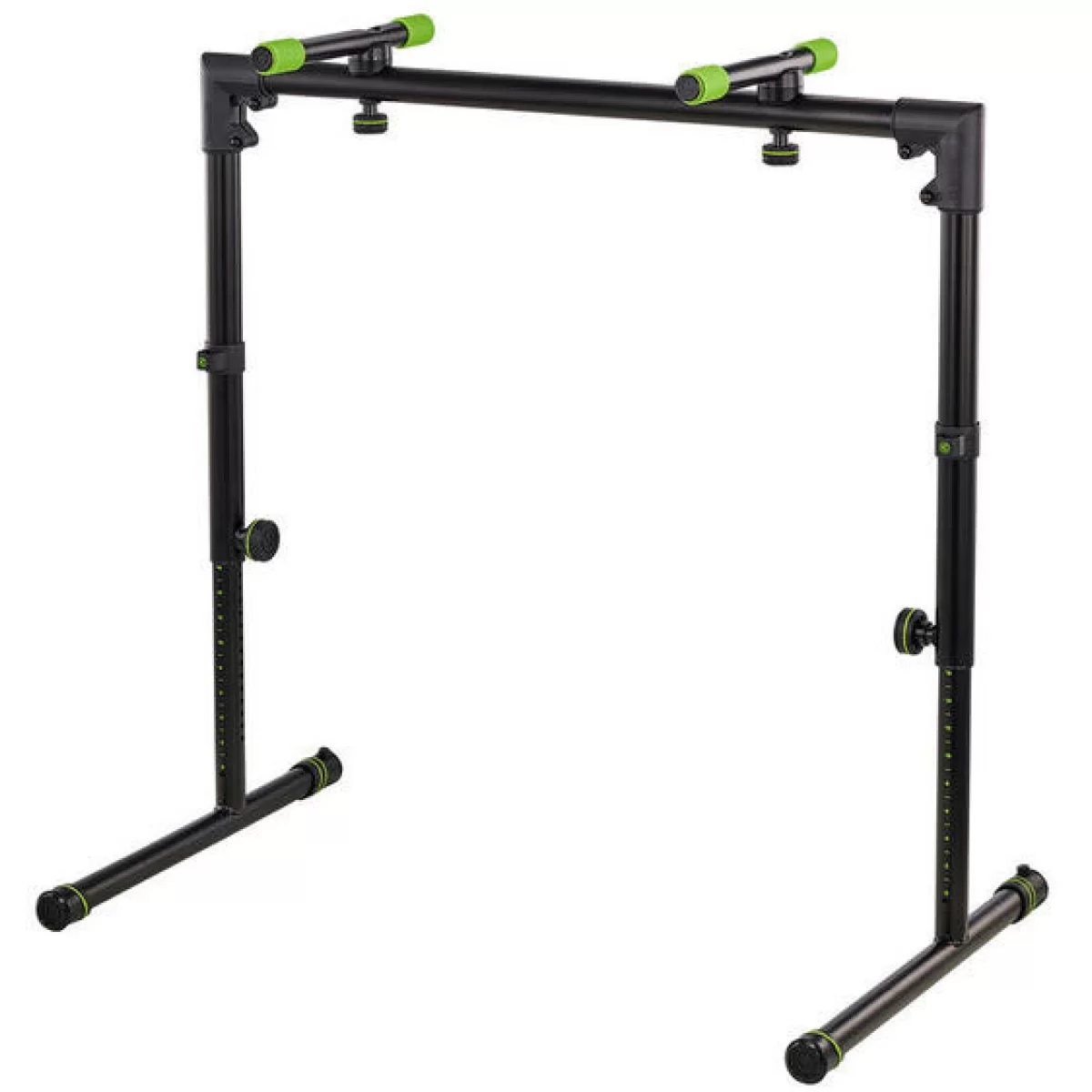 Ножки могут быть установлены в двух основных конфигурациях - либо перпендикулярно вертикальной конструкции, либо слегка наклонены наружу - последняя конфигурация обеспечивает дополнительную устойчивость и больше места для ног. Верхние упоры можно отрегулировать по ширине клавиатуры, а также можно наклонять небольшими шагами в диапазоне 360 градусов. В целом, эта прочная стальная конструкция включает в себя все функции, которые возможны в такой конструкции, без компромиссов.