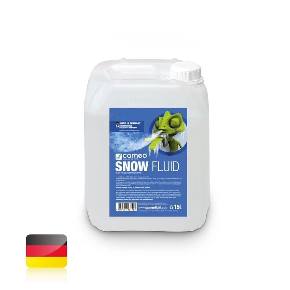 Cameo Snow-Fluid, изготовленная в Германии, не имеет запаха, нетоксична и биоразлагаема; паспорт безопасности DIN и сертификат соответствия доступны для загрузки. Его качество постоянно контролируется; контейнер можно использовать повторно.