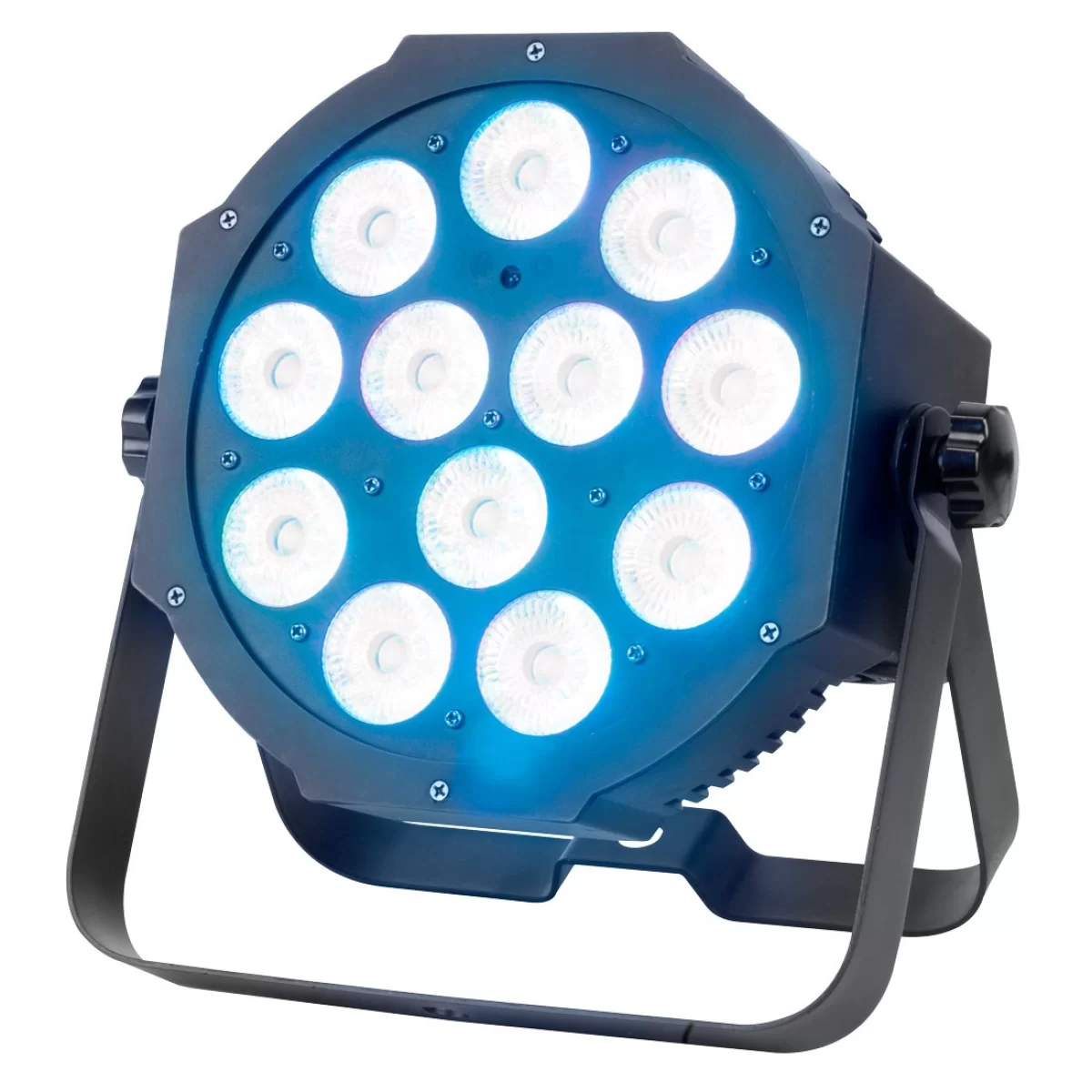 - Сверхяркое плоское устройство Par 64 с 12 светодиодами TRI (RGB 3-в-1) мощностью 3 Вт.