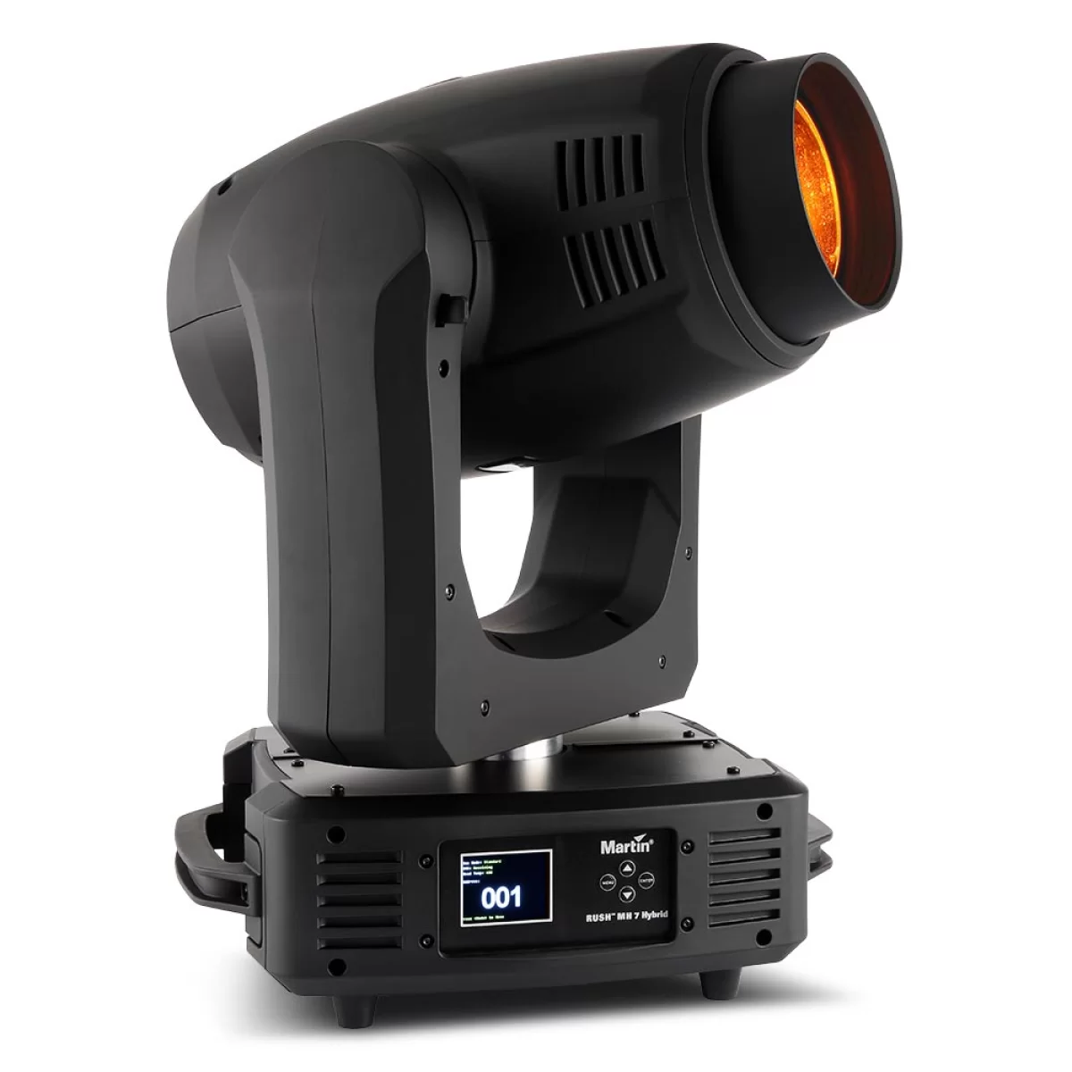 RUSH MH 7 Hybrid от Martin Professional — универсальный прожектор для сцены или клуба. Оптическая система прибора позволяет получить ровную заливку, расставить яркие акценты и создать проекции или интересные лучевые эффекты. Художникам по свету доступны три режима зума: узкий луч, спот и заливка. Прибор укомплектован лампой Philips MSD Platinum 11R, излучающей холодный белый свет, а также цветными светофильтрами, фильтрами для коррекции световой температуры, статическими и вращающимися гобо и призмами.
