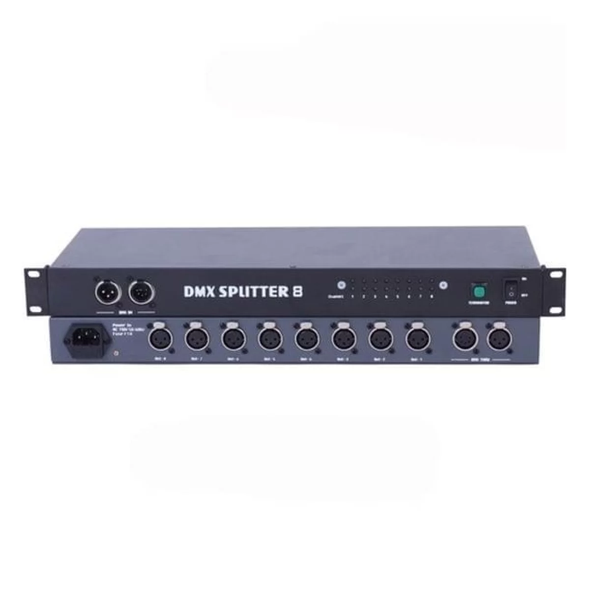 - Подключение кабелей DMX осуществляется через разъемы на передней панели сплиттера.