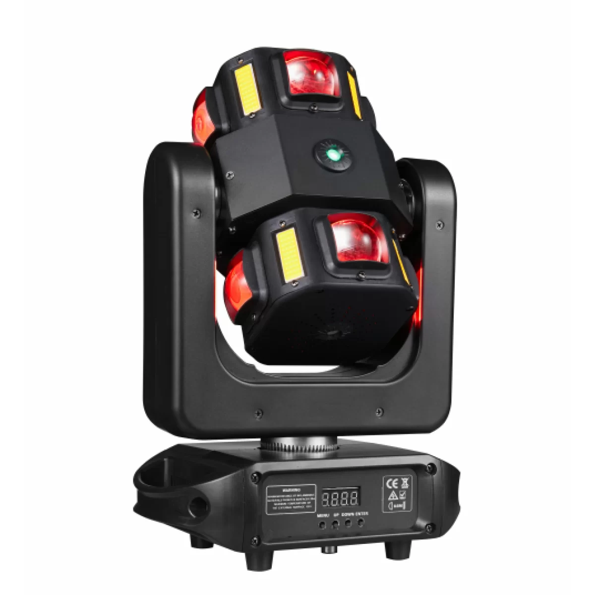 - Управление прибором осуществляется через DMX, что позволяет интегрировать его в более сложные световые системы. Удобный дисплей размером 0,39 дюйма и четыре кнопки обеспечивают легкость настройки и управления.