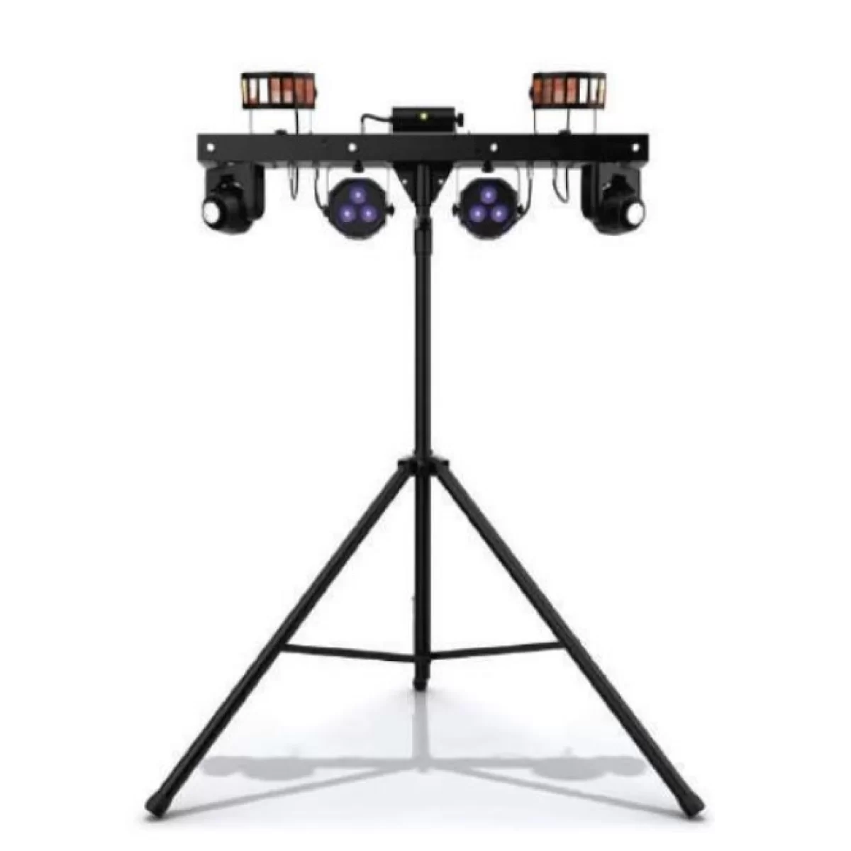 Это целая световая установка 5 в 1, способная сделать световое шоу! Включает две светодиодных движущихся головы, два светодиодных лучевых эффекта, два светодиодных прожектора направленного света, лазерный эффект, светодиодный стробоскоп и все это на специальном штативе с пультом дистанционного управления и ножным беспроводным контроллером-педалью. В комплекте также идет чехол-сумка для транспортировки. Штатив регулируется по высоте 1,5-2,5 м.
