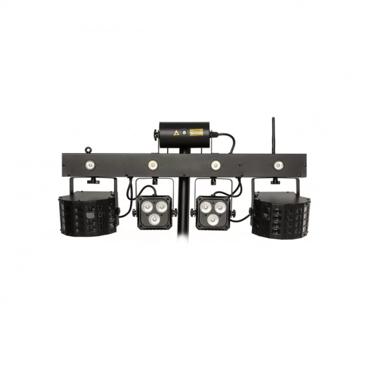 Эффекты установлены на перекладине. В комплект также входит транспортировочный кейс, ИК-пульт ДУ и ножной беспроводной контроллер.