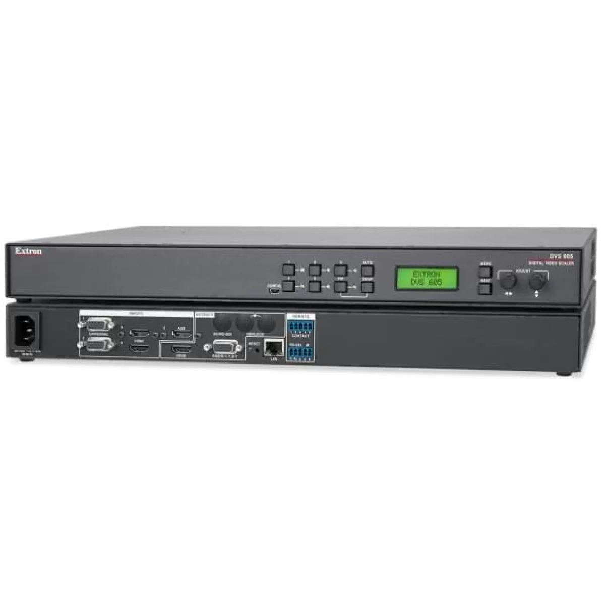 Интерфейс управления на передней панели DVS 605 обеспечивает быстрый доступ к функциям. Предлагается возможность удалённой настройки и управления по USB, RS-232 и Ethernet, а также по «сухим» контактам для управления переключением входов. DVS 605 смонтирован в металлический корпус высотой 1U, в полную ширину стойки, и может быть с лёгкостью интегрирован в различные системы.