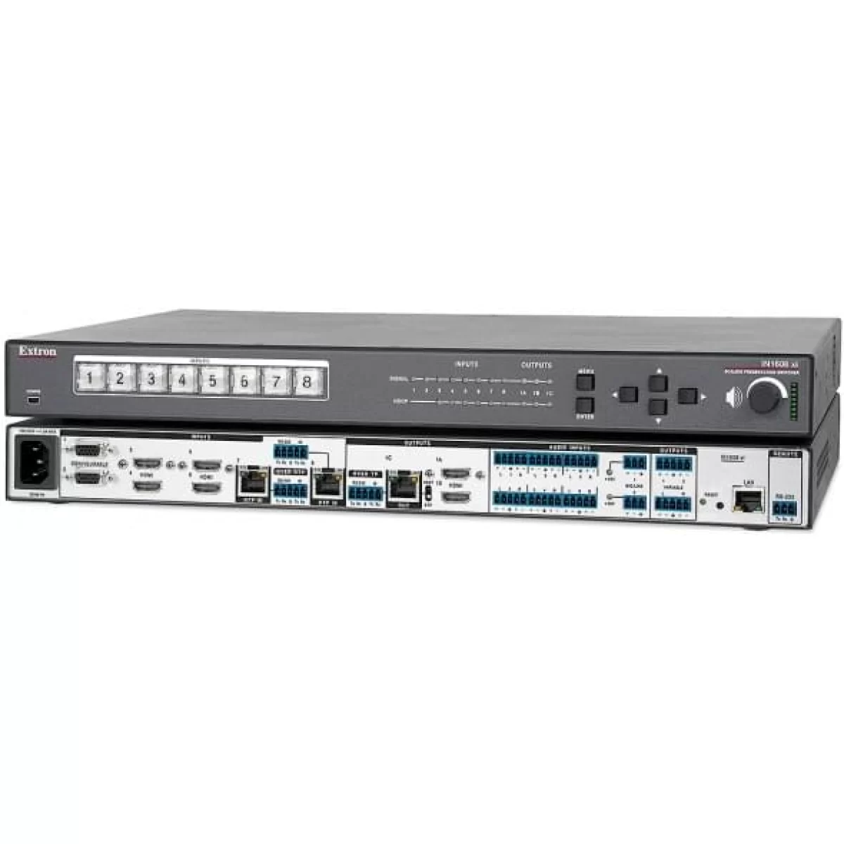 Extron IN1608 xi – это HDCP-совместимый скалирующий презентационный коммутатор Extron с четырьмя входами HDMI, двумя универсальными входами для аналогового видео и двумя входами Extron DTP®. Он предлагает два выхода HDMI, один выход DTP, интегрированный аудиоусилитель класса D и встроенный процессор управления линейки IPCP Pro для управления полнофункциональной AV‑системой. Входы и выход DTP взаимодействуют с конечными точками DTP для передачи видео, аудио и двунаправленных сигналов управления. Для каждого подключения DTP на приёмнике/передатчике необходим всего один экранированный кабель CATx. DTP‑выход может быть настроен на поддержку режима HDBaseT. Коммутатор IN1608 xi обеспечивает поддержку локальных и удалённых источников и дисплеев вместе с быстрой и надёжной коммутацией источников, а также включает в себя высокопроизводительный скалирующий процессор для источников HDMI и аналоговых сигналов. IN1608 xi также имеет набор функций для коммутации и обработки аудио.