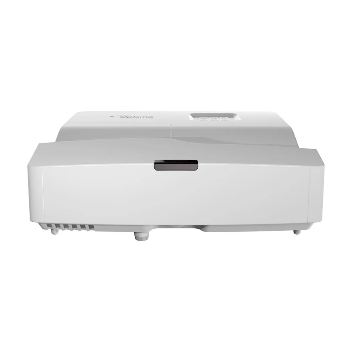 Использование ультракороткофокусного объектива означает, что он может проецировать изображение размером 100 дюймов с расстояния менее 0,5 м. А установка проектора так близко к стене позволяет избежать попадания на экран теней от докладчиков.