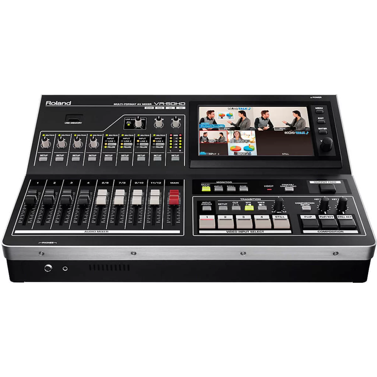 Встроенный в Roland VR-50HD сенсорный монитор предварительного просмотра оснащен большим сенсорным 7-ми дюймовым ЖК-экраном, который обеспечивает интуитивное управление. Благодаря использованию семи каналов мульти просмотра для вывода четырех картинок с входа, отпадает необходимость в подключении внешних мониторов. Вы так же можете переключиться в режим quad multi-view. Расширенные настройки видео и аудио доступны так же и на сенсорном экране, так что вы сможете начать работу сразу, не читая инструкции.