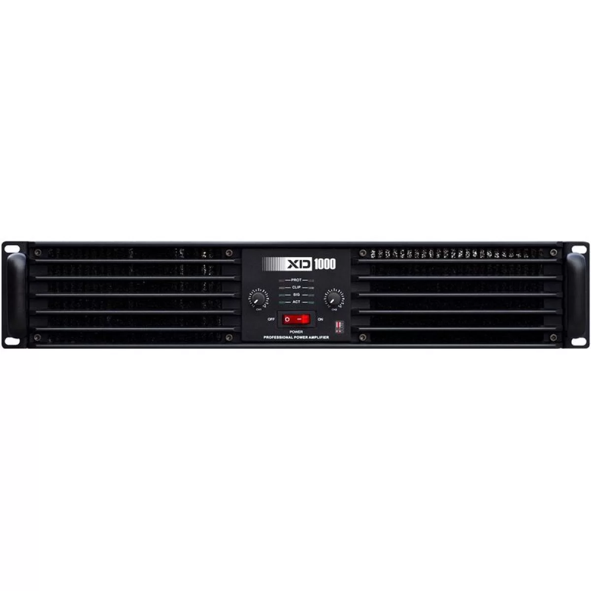 Полная выходная мощность у Eurosound XD-1000 составляет 1000 Вт/канал с нагрузкой 8 Ом, 1500 Вт/канал @ 4 Ом и 2000 Вт/канал усилитель выдаст с двухомной нагрузкой. Фронтальная панель предоставляет доступ к основным регулировкам уровня обоих каналов раздельно, а также к светодиодам клиппинга, лимитера и наличия сигнала, тоже раздельным для каждого канала. Тумблер питания располагается на передней панели, как и его светодиод. На передней панели находятся и воздухозаборники: для лучшего охлаждения воздух прогоняется сквозь корпус и выводится наружу с помощью вентилятора на тыловой части. На тыловой панели, помимо вентиляционных отверстий, располагаются входные балансные разъемы на XLR, которые позволят подсоединять разнообразные источники, выходные разъемы на speakON, и сквозные на XLR. Также там можно найти группу DIP-переключателей, которые предназначены для установки ограничения максимальной мощности, а также для установки максимальной мощности для каждого канала раздельно. С помощью переключателя #10 активируется параллельный режим: в нем сигнал идет через вход первого канала и подается на оба канала усилителя. При этом громкость обоих каналов устанавливается с помощью регулятора первого канала. Эффективная система охлаждения на основе вентиляторов и медных радиаторов позволит усилителю функционировать продолжительное время.