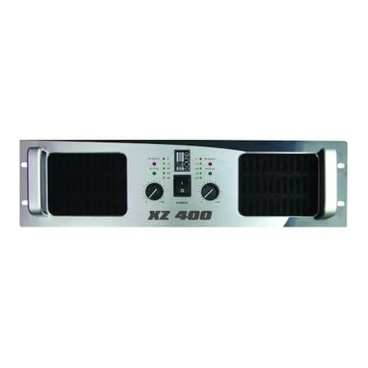 Двухканальный усилитель мощности Eurosound XZ-400 входит в серию профессиональных моделей фирмы, предназначенных для использования в составе инсталлированных аудиосистем, в том числе и для озвучивания киноконцертных залов. Аппарат выполнен в металлическом корпусе современного дизайна, предназначенном для рэкового размещения. На передней панели усилителя расположены регуляторы громкости двух каналов, а также индикаторы уровня сигнала и перегрузки. Значительную часть поверхности передней панели занимают вентиляционные решетки, воздух сквозь которые затягивается внутрь парой вентиляторов, расположенных сзади.