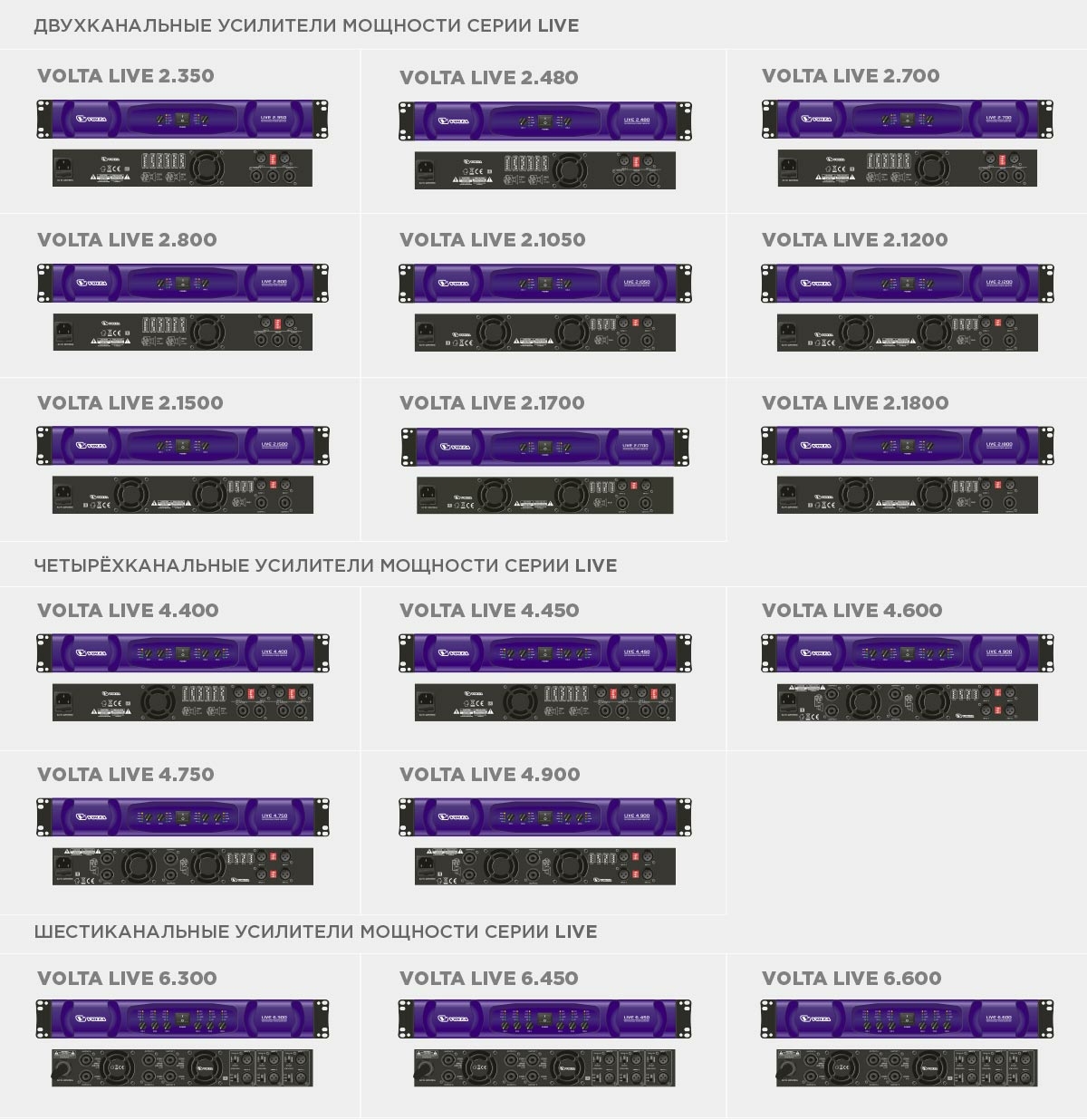 Новая серия усилителей мощности VOLTA серии LIVE является ярким примером развития отрасли современного звукоусиления. Серия LIVE - это большая линейка универсальных усилителей мощности класса D, представленных в 2-, 4- и 6-канальных версиях. Значения параметров мощности усилителей лежат в границах от 200 до 1800 Вт\канал. А широкий ассортимент усилителей VOLTA LIVE позволяет оптимально подобрать усилитель под характеристики акустических систем.