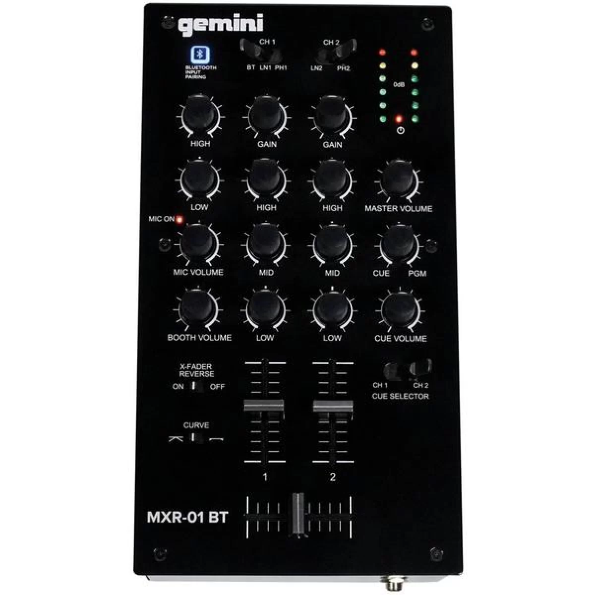 Gemini MXR-01BT имеет два основных фейдера, кроссфейдер оснащен регулятором кривой и свитчем реверса и его можно легко заменить. Доступно два трехполосных эквалайзера для двух каналов, и один дополнительный двухполосный для микрофона. Переключатель типа огибающей кроссфейдера позволяет настроить микшер под определенный стиль игры микса. Для предварительного прослушивания имеется переключатель Cue Selector и отдельный регулятор громкости. Рядом расположен регулятор Cue/Pgm, позволяющий контролировать подаваемый сигнал в наушники с предпрослушивания или с основного микса. Для отображения выходного уровня громкости имеется LED-индикатор из шести сегментов. Под ним расположен регулятор общей громкости сигнала.