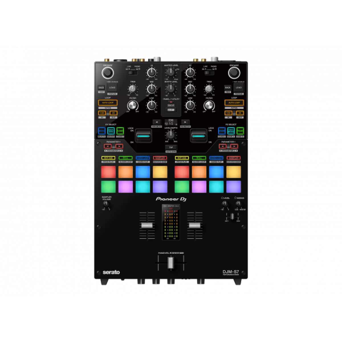 Если у вас был опыт работы с DJM-S11 в прошлом, вы легко привыкните к понятному интерфейсу DJM-S7. Большая кнопка загрузки и 16 сенсорных пэдов (по 8 на деку) облегчают выбор дорожек и активацию сэмплов и функций во время энергичных сетов. В этот микшер включены все 22 эффекта Beat FX из модели DJM-S11. Рычаги эффектов динамически подключают не только эти стандартные, но и программные эффекты. Режимы пэдов работают независимо, что позволяет активировать метки быстрого доступа на 1 канале, и одновременно использовать режим Roll на 2 канале. Кроссфейдер Magvel Fader Pro стабильно работает во время выступлений.