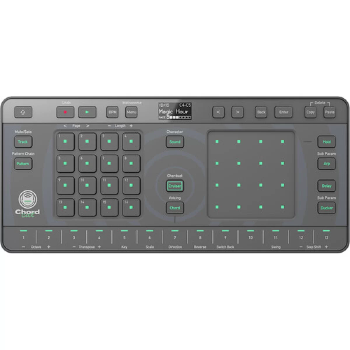 AlphaTheta Chordcat — компактный грувбокс, совмещающий 4x4 шаговый секвенсор, встроенные звуковые банки и инновационный алгоритм Chord Cruiser, предлагающий до 110 000 комбинаций аккордов (на основе 18 жанровых пресетов), для генерации аккордовых прогрессий и построения ритмических паттернов.