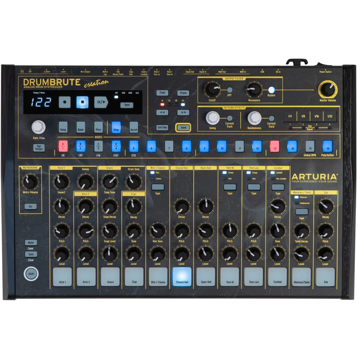Arturia DrumBrute Creation Edition — Полностью аналоговаaя драм-машина, оборудованная продвинутым 64-шаговым секвенсором.
