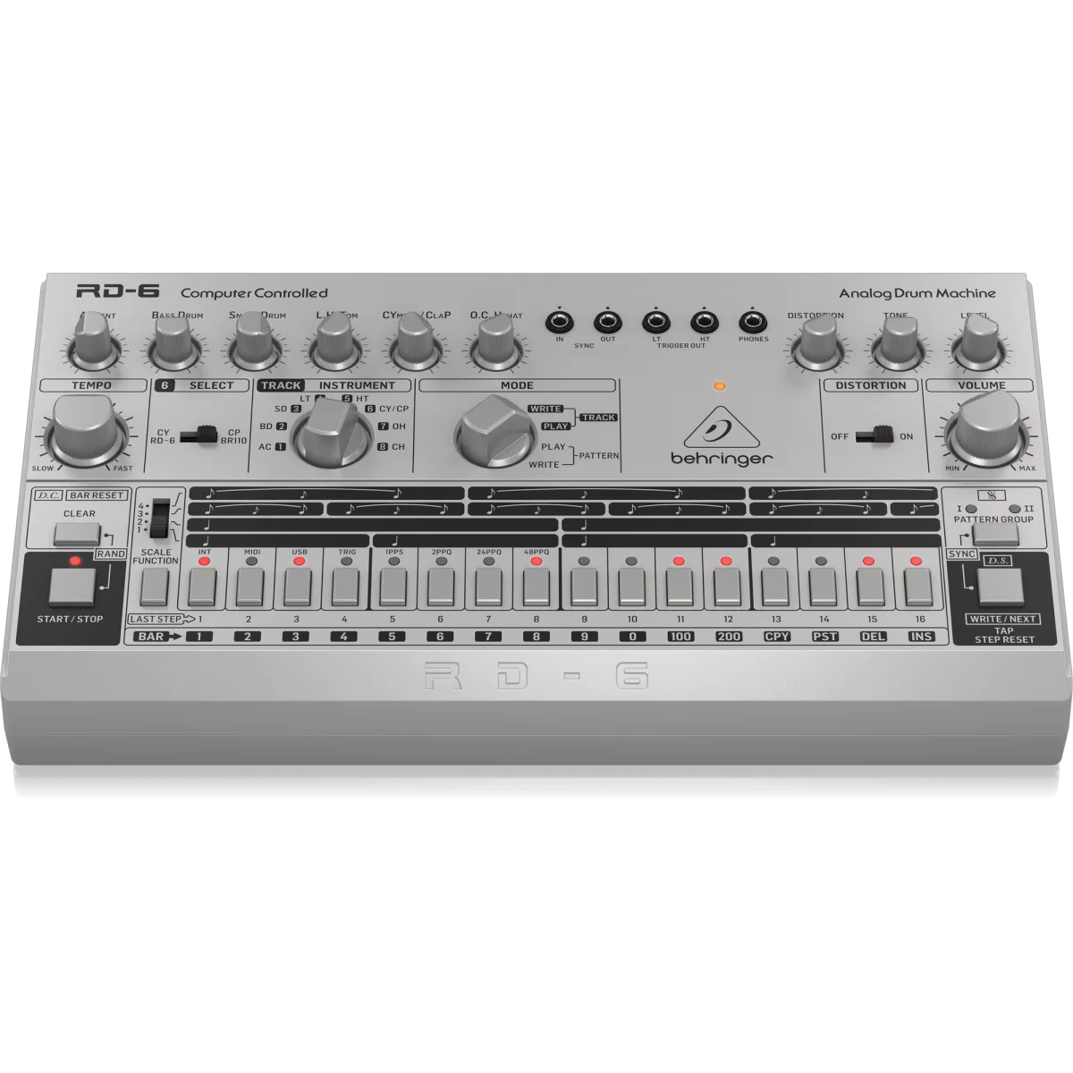 Behringer RD-6-SR — это современная реплика культовой аналоговой драм-машины TR-606 с новыми функциями. Содержит 8 аналоговых звуков ударных (бас-бочка, снейр, низкий и высокий том, тарелка и клэп от DR-110, открытый и закрытый хэты). 16-шаговый секвенсор позволяет переключаться в реальном времени между 32 паттернами, которые в свою очередь можно обьединить в цепочку из 256 тактов.