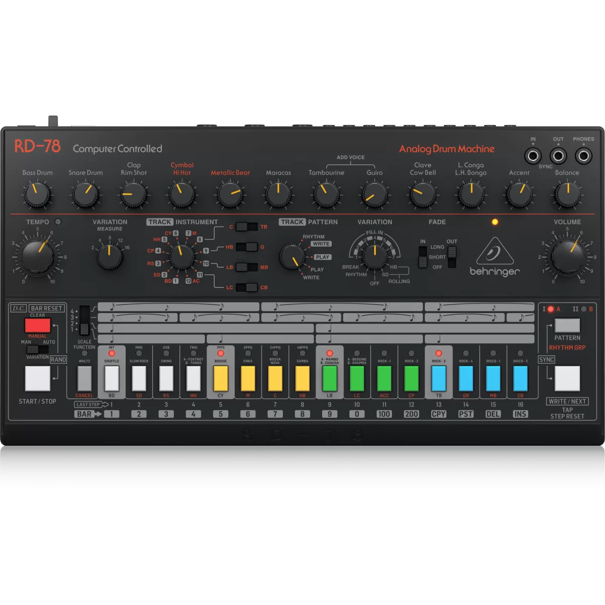 Описание подготовлено командой сайта samid.ruBehringer RD-78 - аналоговая драм-машина, основанная на модели Roland CR-78. Устройство снабжено 15 звуками барабанов, 34 культовыми ритмическими пресетами и 16-шаговым секвенсором (может объединять пресеты в песни до 250 тактов). Кроме того, каждый звук обладает своим собственным потенциометром громкости, а также предусмотрены переключатели для звуков вариаций, включая все функции заполнения в дополнении с Fade I/O. Также модель располагает функцией отключения звука барабанов (позволяет выключать звуки, не задействуя отдельные регуляторы громкости). Коммутационные возможности представляют из себя 10 отдельных выходов, выход Mix, разъёмы управления педалями, пятиконтактный MIDI I/O, порт USB, разъёмы Sync In и Out и выход под наушники.