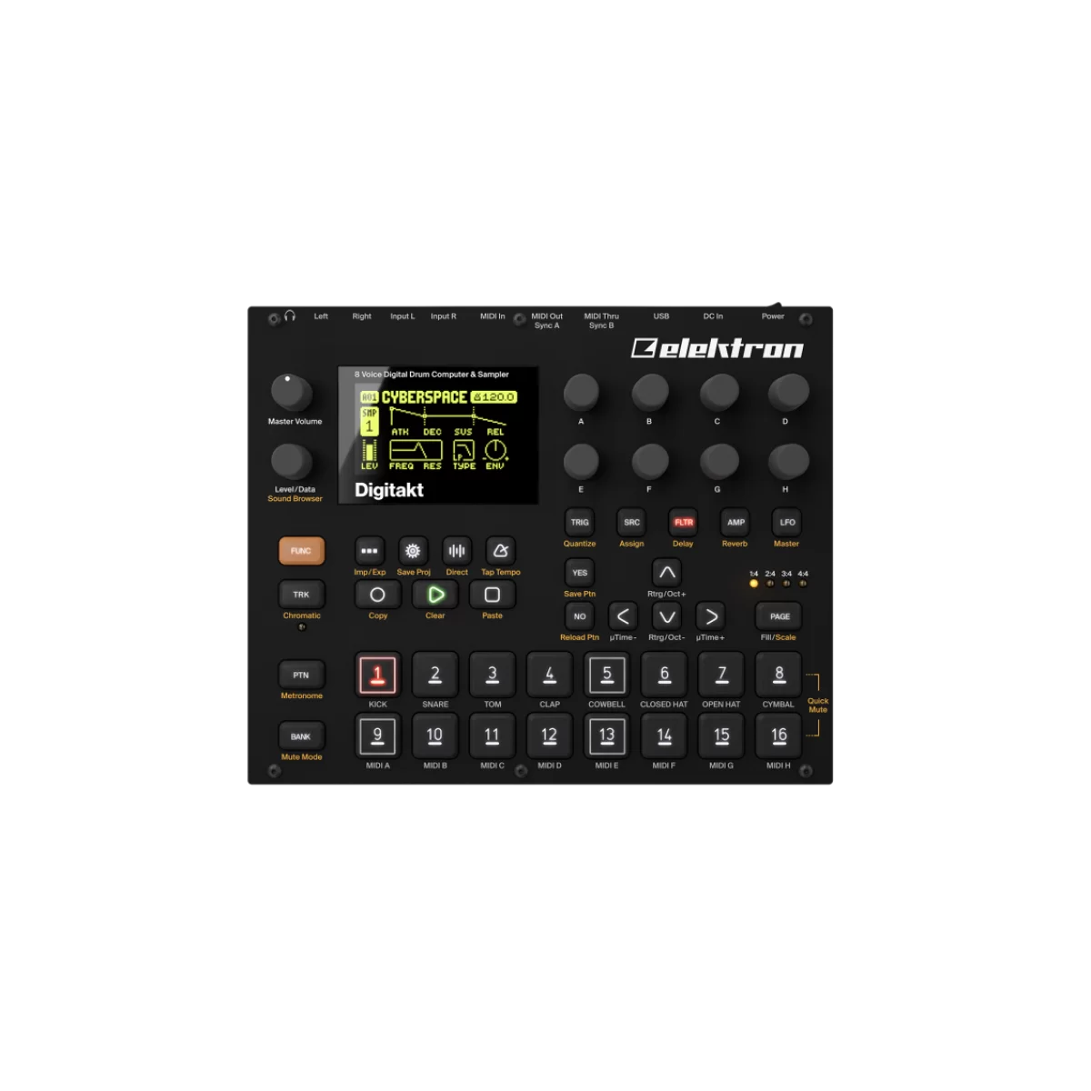 Драм-машина обладает компактными размерами, а также интуитивно понятным интерфейсом, что позволяет быстро овладеть данным прибором. Elektron Digitakt идеально подойдёт как для работы в студии, так и для живых выступлений. Драм-машина оснащена OLED дисплеем, 8 аудио- и миди дорожками, а также возможностью подключения внешних приборов. Устройство имеет гибкий звуковой движок, секвенсор и возможность сэмплирования.