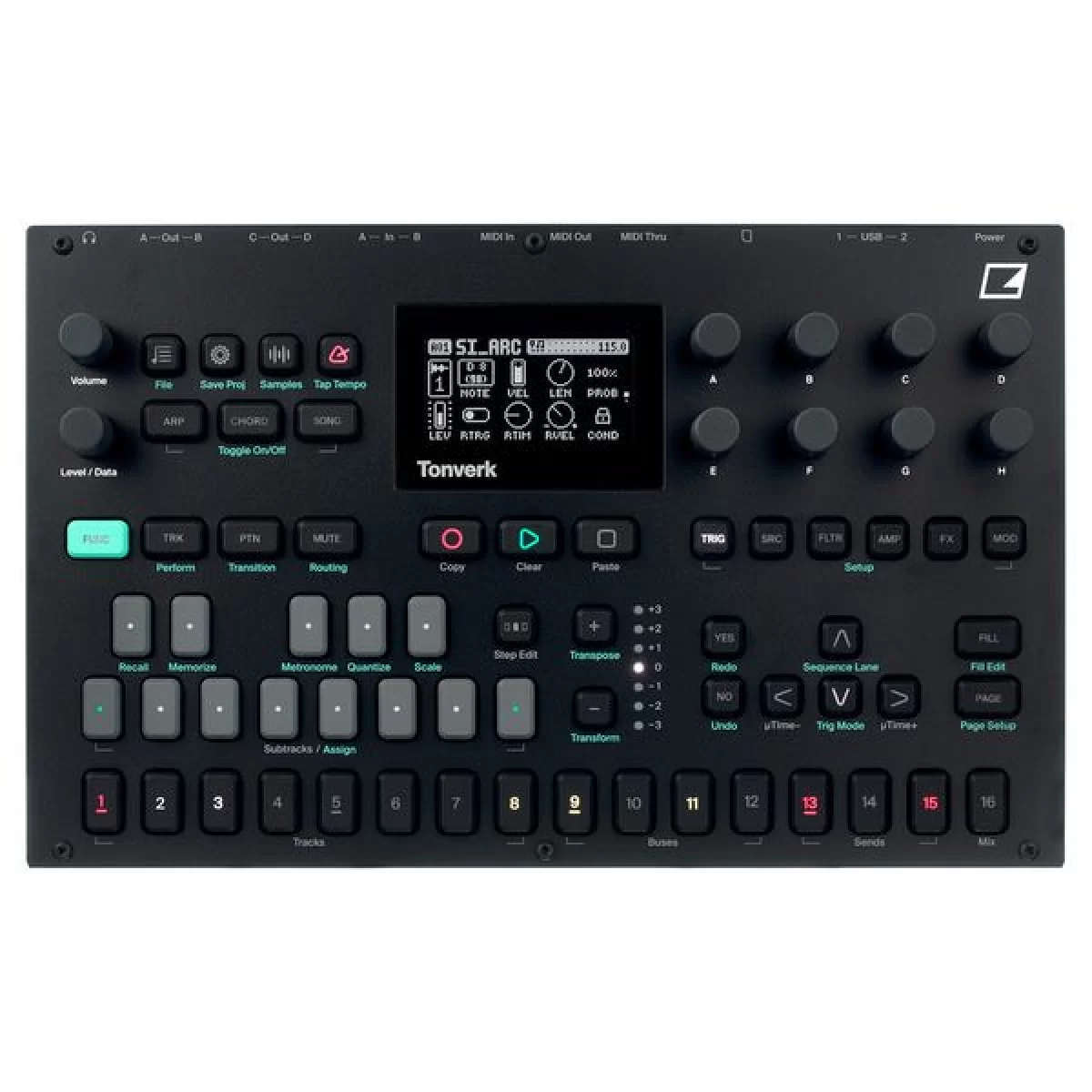 Elektron Tonverk — полифонический мульти-семплер и рабочая станция обработки аудио c поддержкой мультисэмпловых инструментов. Tonverk имеет гибкую архитектуру с 16 треками (8 аудио-треков + 8 служебных треков) и продвинутой маршрутизацией шин и эффектов. Каждый трек снабжён собственным секвенсером с поддержкой до 256 шагов на паттерн, независимой длиной паттерна и полифоническими параметр-локами, позволяя программировать per-step velocity, trig-conditions и micro-timing. Аппарат поддерживает мультисэмплинг и Auto-Sampler для быстрого создания инструментов, предоставляет до 64 голосов полифонии и возможность создания под-дорожек (subtracks) для драм-партий (до 8 моно-subtracks на аудиотрек). Tonverk оснащён мощным набором эффектов (реверб, delay, компрессия, flanger, chorus, degrader и др.), парой балансных входов, четырьмя балансными выходами, MIDI In/Out/Thru, двумя USB-C, слот-ом SD и 128×64 OLED-экраном в стальном корпусе.