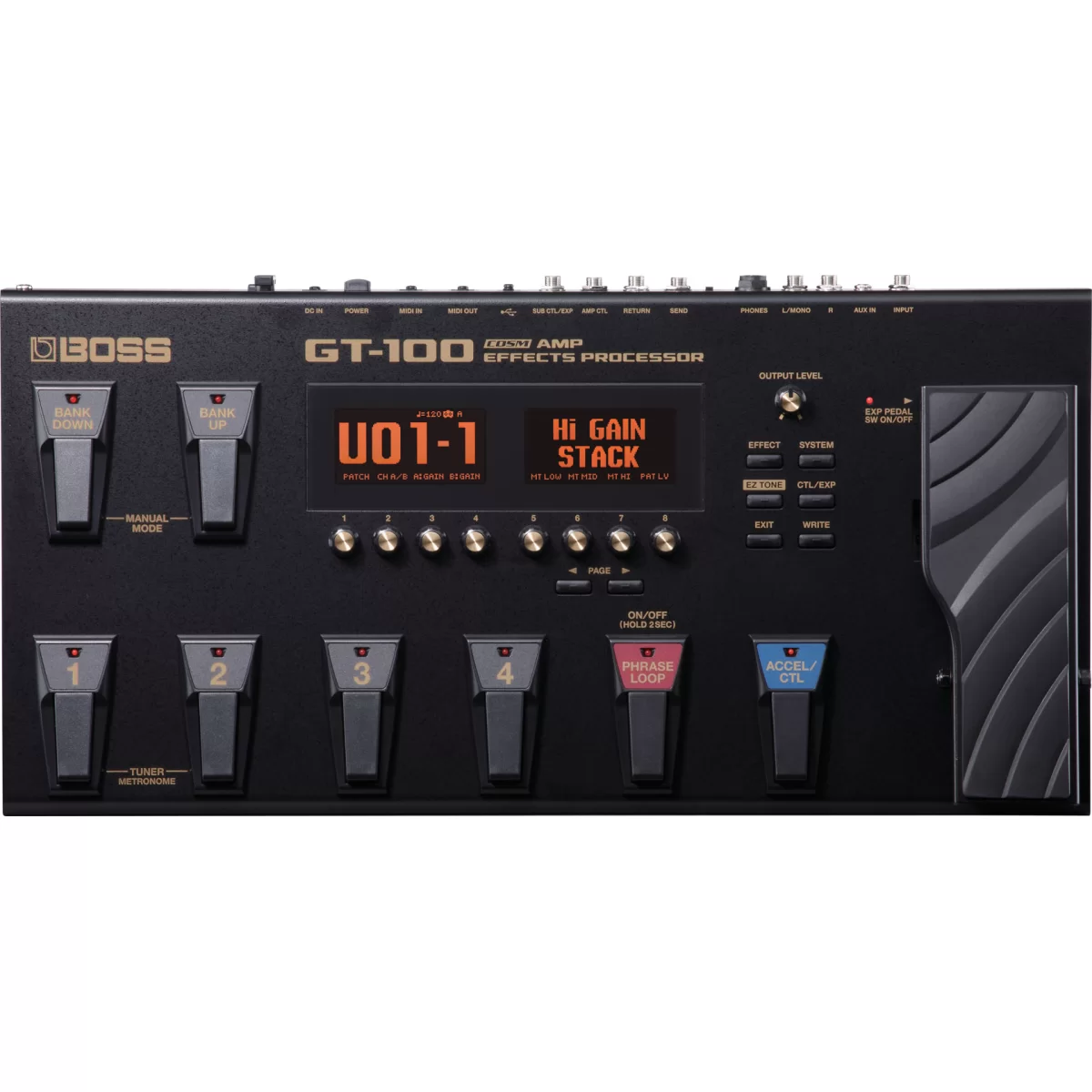 Наконец, BOSS GT-100 оснащен уникальным двойным ЖК-дисплеем, обеспечивающим быстрый доступ к каждому параметру. На нём отображается вся актуальная информация используемых пресетов и их функциональные характеристики во время редактирования. Также на корпусе с тыловой части можно найти пару стереовыходов с разъёмами 1/4" Jack TS, выход на наушники на разъеме 1/4" Jack TRS, входной разъем aux in на mini-Jack 3.5 мм и посыл/возврат на внешние процессоры эффектов, а также прочие устройства для внешнего контроля.