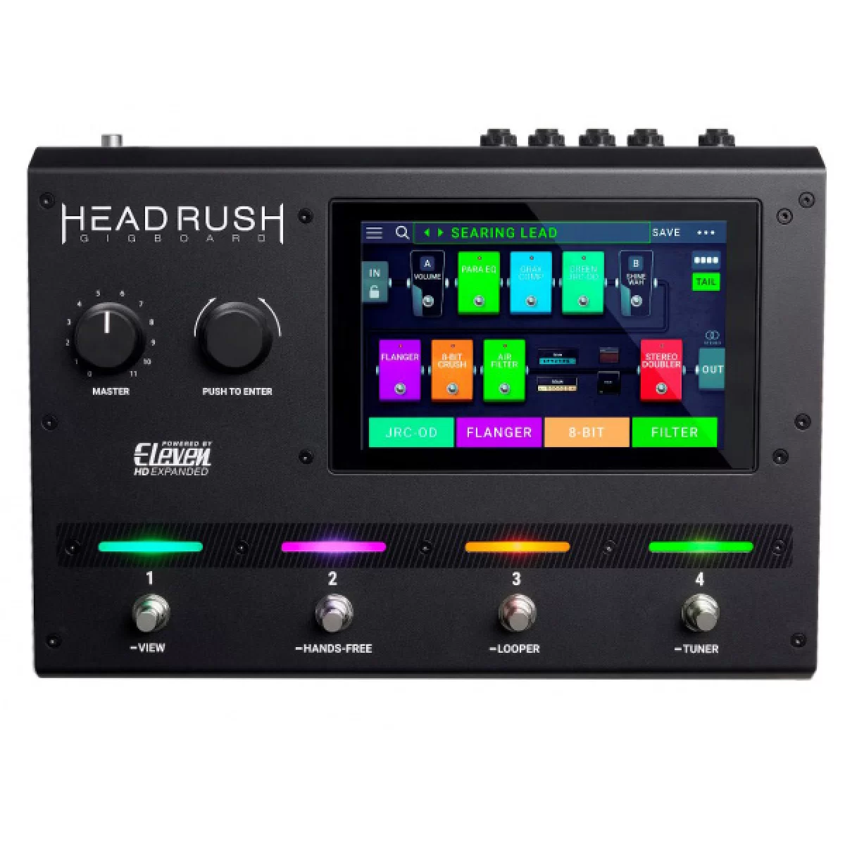 Устройство имеет 4-ядерный процессор и эксклюзивное ПО ElevenHD Expaned DSP. Обеспечивает выбор из 34 моделей усилителей, 15 моделей кабинетов, 10 микрофонов и 48 видов эффектов - 6 овердрайв/дисторшн, 5 эквалайзеров, 7 модуляций, 7 эффектов реверб/дилэй, 5 режимов работы педали экспрессии. Кроме этого, доступны 4 ножных переключателя эффектов, педаль экспрессии и яркий сенсорный экран 7". Процессор эффектов HeadRush Pedalboard представляет реалистичный и гибкий в настройках звук лучших кабинетов усилителей, микрофонов и эффектов.