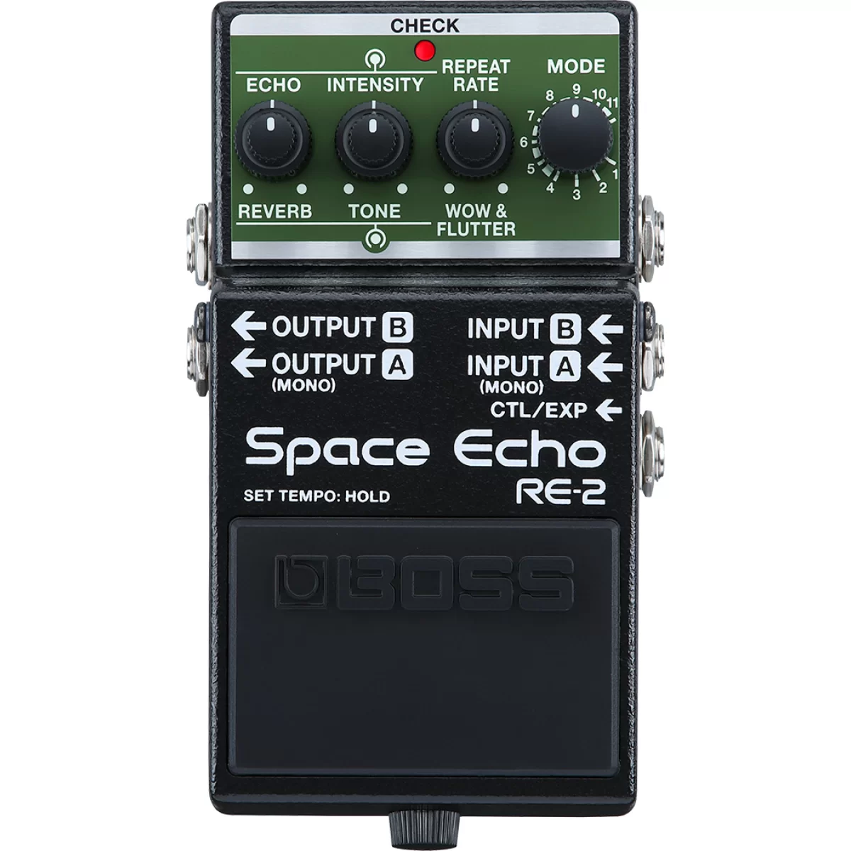 В 2008 году было выпущено первое цифровое переиздание Space Echo в виде двойной педали BOSS RE-20, которая впоследствии также обрела культовый статус. Новая версия RE-2 предлагает тот же богатый функционал в более компактном корпусе и имеет современные АЦ/ЦА-преобразователи, обеспечивающие чистое звучание без искажений. Устройство обладает аутентичным звуком пленочного дилея с неравномерной модуляцией, особой частотной характеристикой и реакцией на изменение параметров. Эффект можно использовать как для короткого slapback-эхо или обычного ритм-дилея, так и для создания глубоких и атмосферных подкладов, идеально подходящих для музыки в стилях эмбиент, дрим-поп или шугейз.