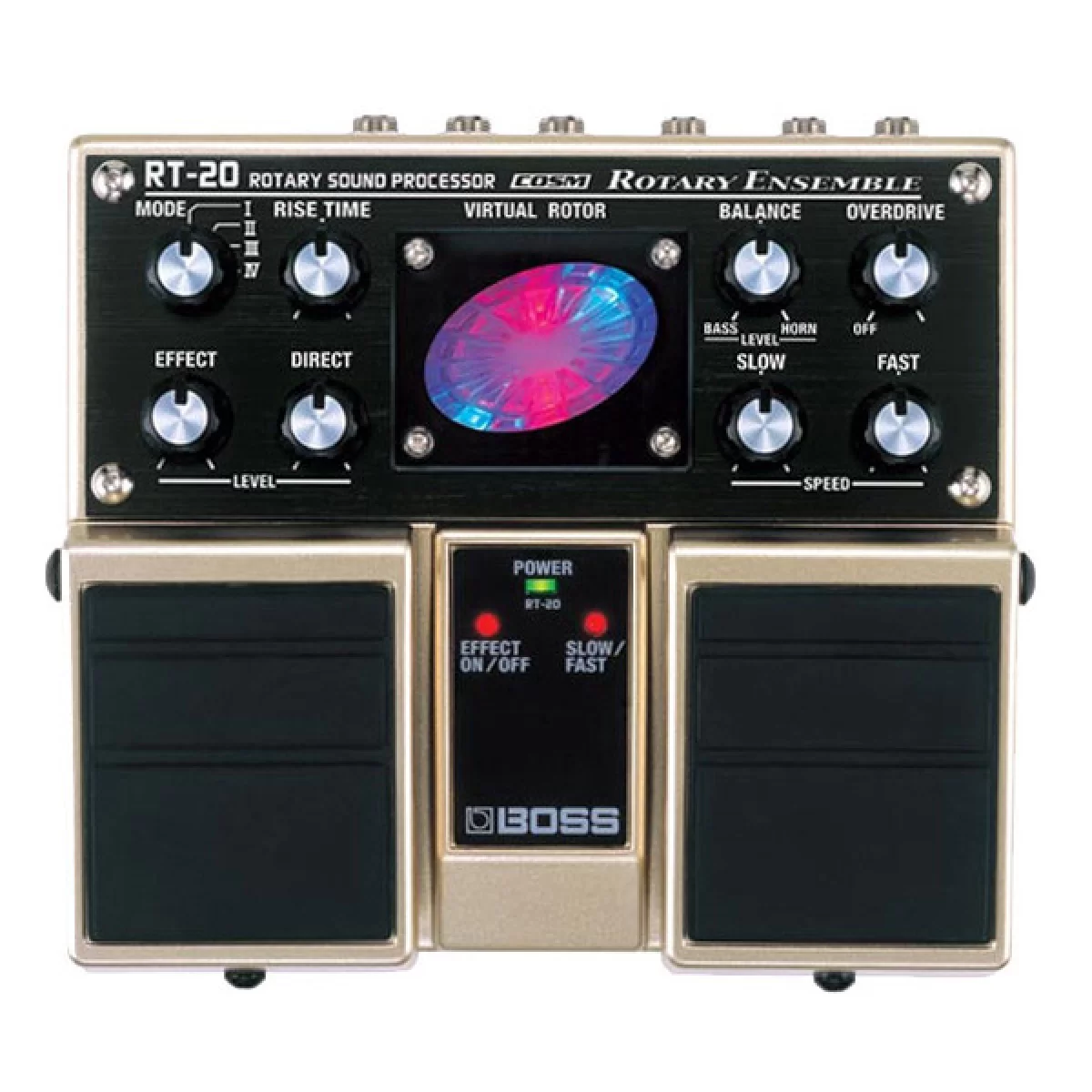 BOSS RT-20 – Это двойная напольная педаль эффекта «ротари» для гитаристов. Эффект вращающегося динамика «ротари» (известный также как «эффект Лесли») использовало множество великих гитаристов – от Beatles до Джеффа Бэка, Сантаны или Стиви Рэя.