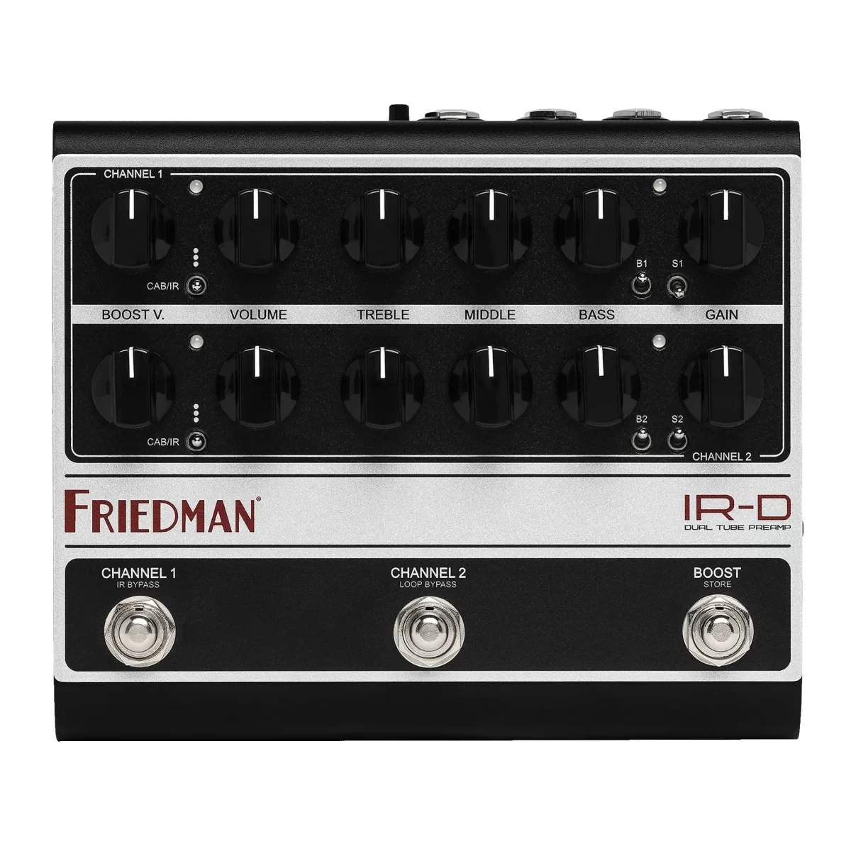 Ламповый преамп Friedman IR-D реализован в таком же напольном форм-факторе, что и Friedman IR-X, а его расцветка намекает на то, что его задача воспроизвести звучание и ощущение усилителей Friedman Dirty Shirley и Twin Sister. И действительно, как и Twin Sister, IR-D имеет два одинаковых канала Dirty Shirley, вдохновлённых звучанием винтажных Marshall JTM45, но более гибких в настройках. Оба канала имеют полностью независимые настройки гейна, громкости, эквализации и буста, а также переключатели Bright и Tight. Причём в отличие от IR-X, имеющего по одному из них на разных каналах, у IR-D оба переключателя присутствуют у каждого из каналов. Что же касательно разницы в звуке, IR-D менее хайгейновый, с большим запасом низов, и более пробивной серединой, чем IR-X. Если Friedman IR-X по металу и "дж-дж", то IR-D больше по классическому року.