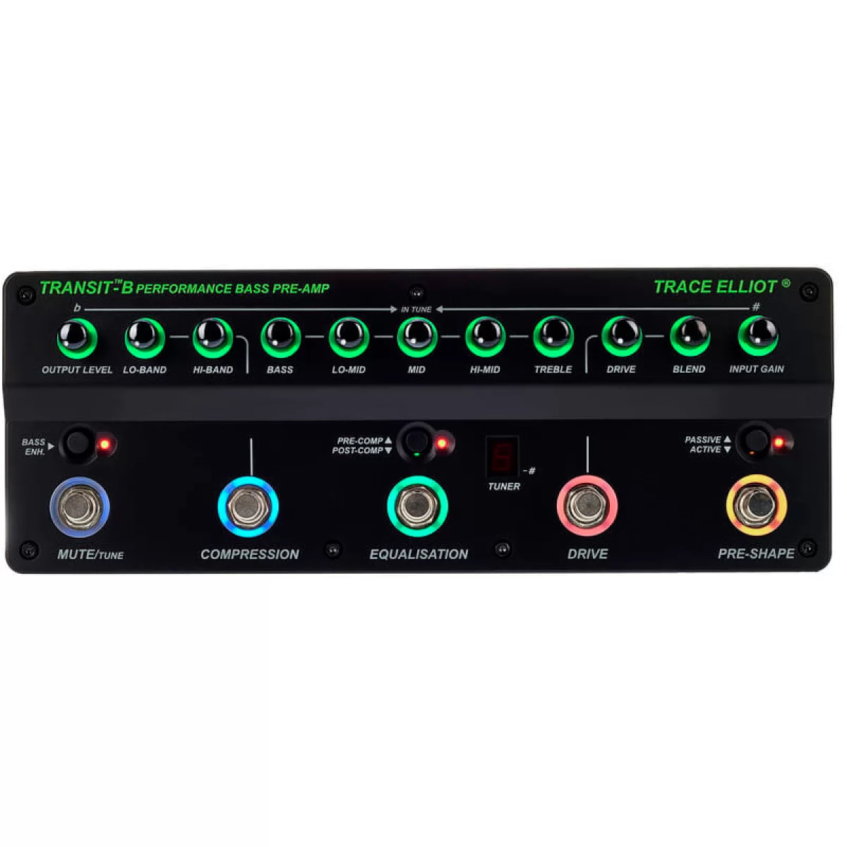 Trace ElliotTrace Elliot Transit B - Это профессиональный предусилитель для бас-гитаристов, оснащённый 5-полосным эквалайзером, системой Pre-Shape с выбором режимов (Passive/Active), эффектом Drive с настройками перегруза, эквалайзером с выбором режимов (Pre-Comp и Post-Comp), двухполосным компрессором и кнопкой Mute/Tune.