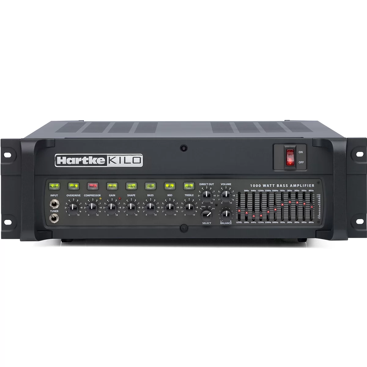 Hartke Kilo 1000 - Басовый усилитель, мощность 2х500 ватт на 8, 4 или 2 Ома или 1000 ватт моно в режиме “моста”, ламповый предусилитель (три лампы 12AX7), 10-полосный графический эквалайзер, регулировки Bass, Treble, Mid, фирменная функция Hartke Shape и овердрайв Bass Atta Kilo 1000 Басовый усилитель 2х500 Вт, 10-ти полосный эквалайзер, компрессор, Bass Attack Overdrive